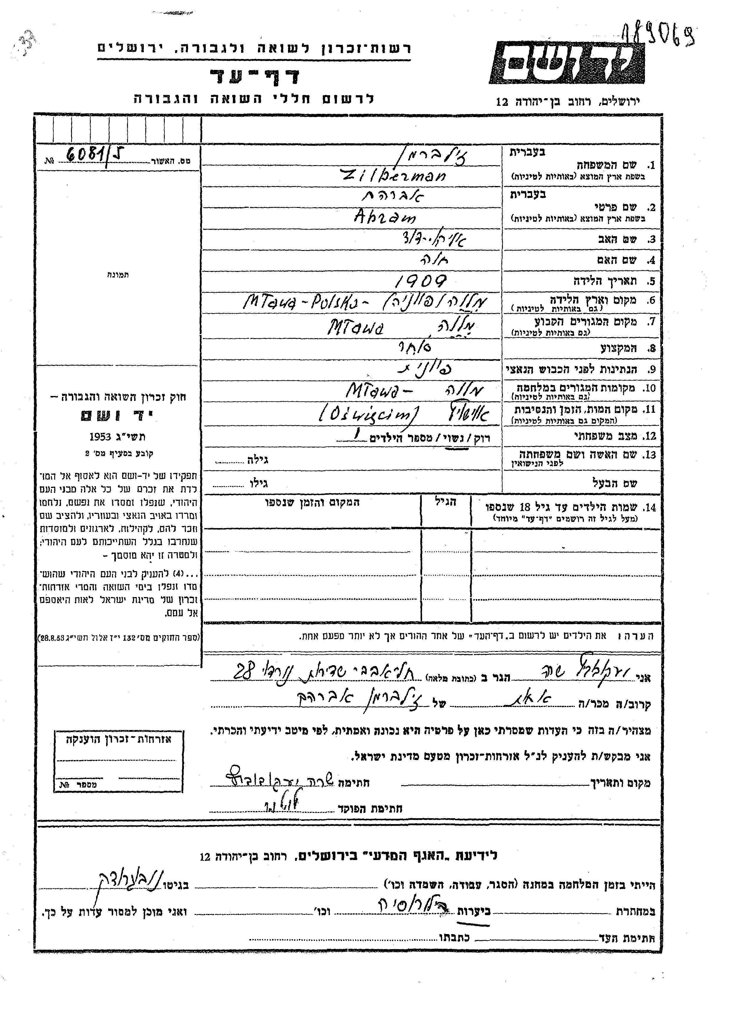 Zilberman Abram 1909 Mlawa, Pologne Feuille de témoignage