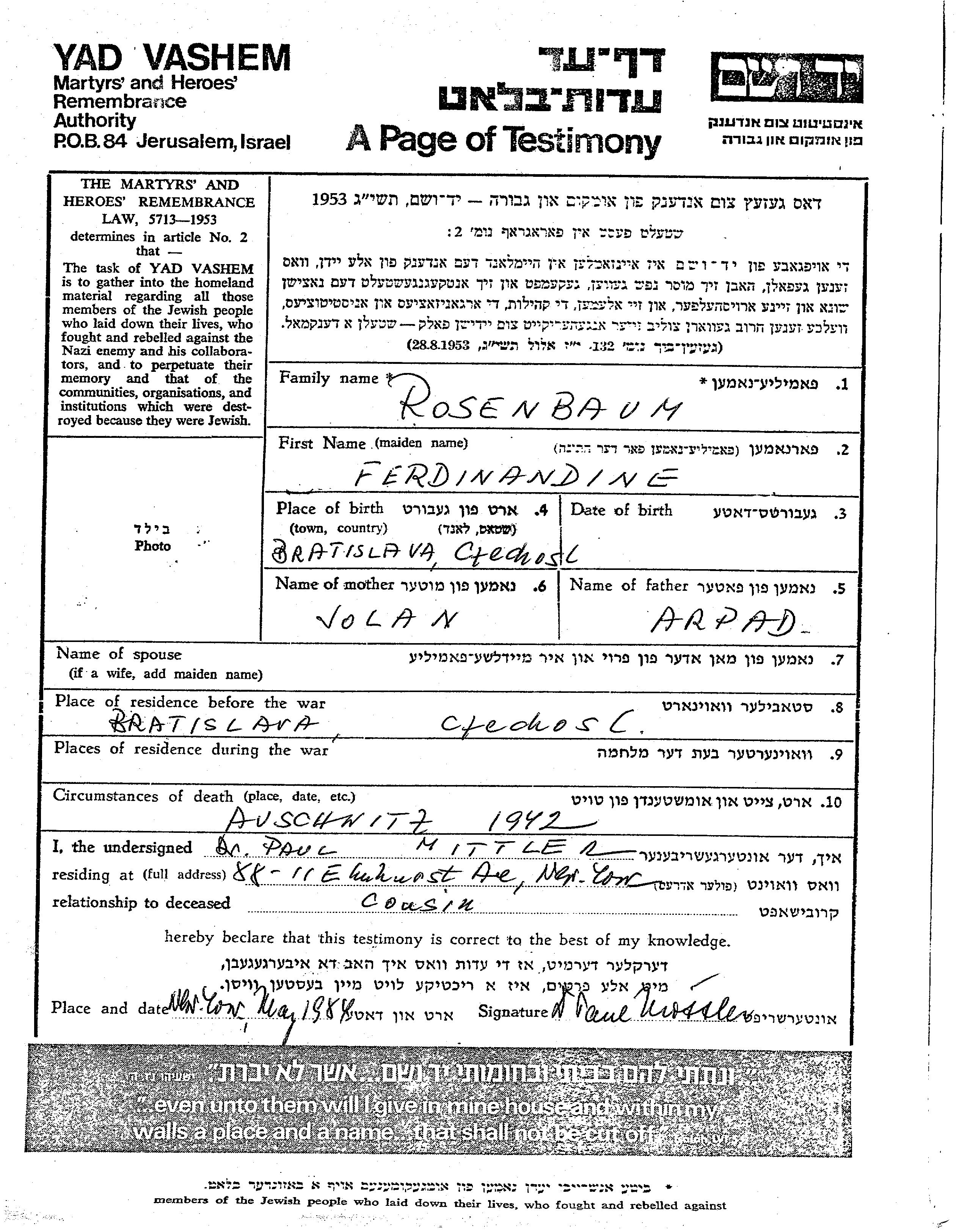 Rosenbaum Ferdinandine Bratislava, Tchécoslovaquie Feuille de témoignage