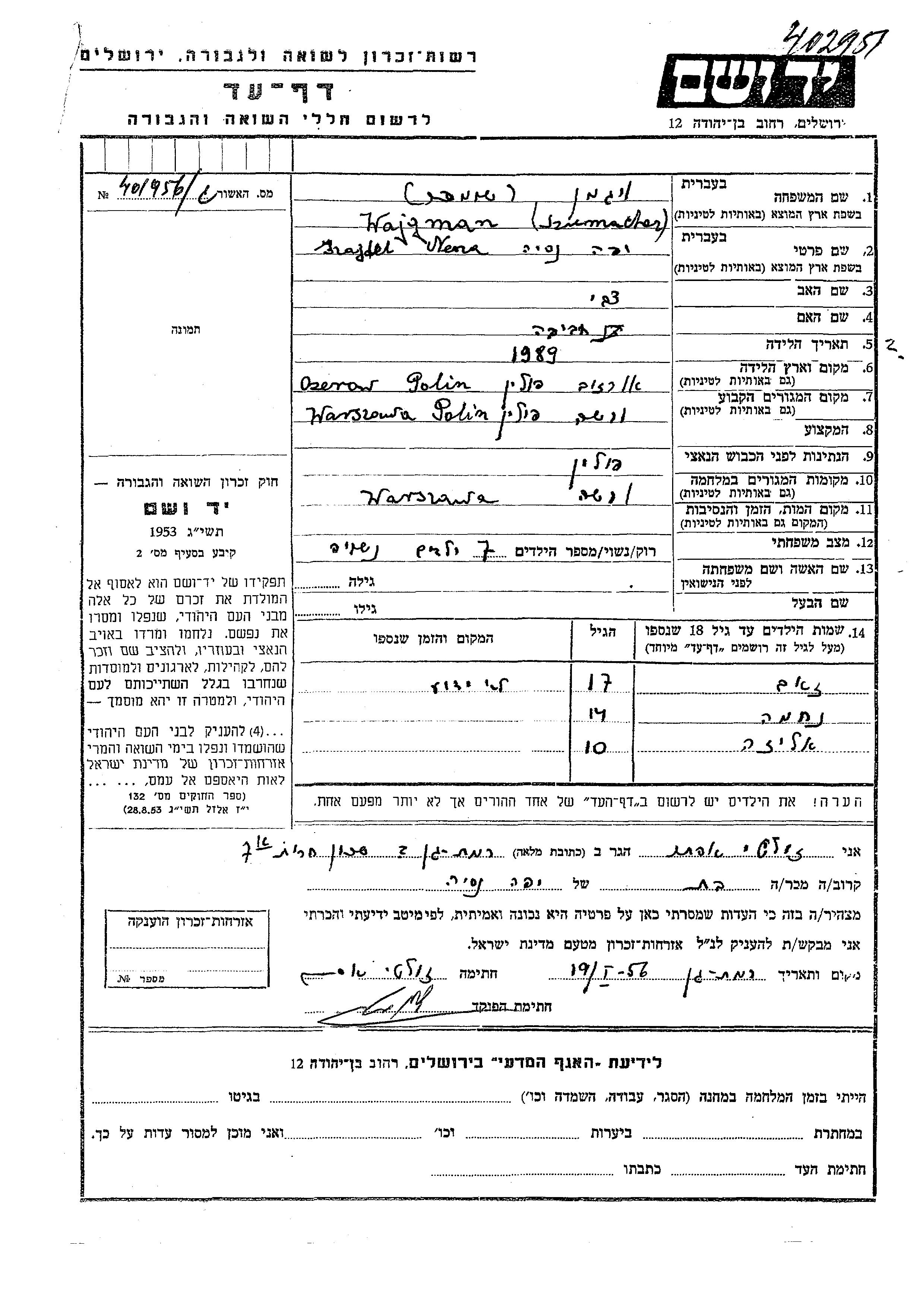 Wajgman Vigman Nesia Yafa Warsaw, Pologne Feuille de témoignage