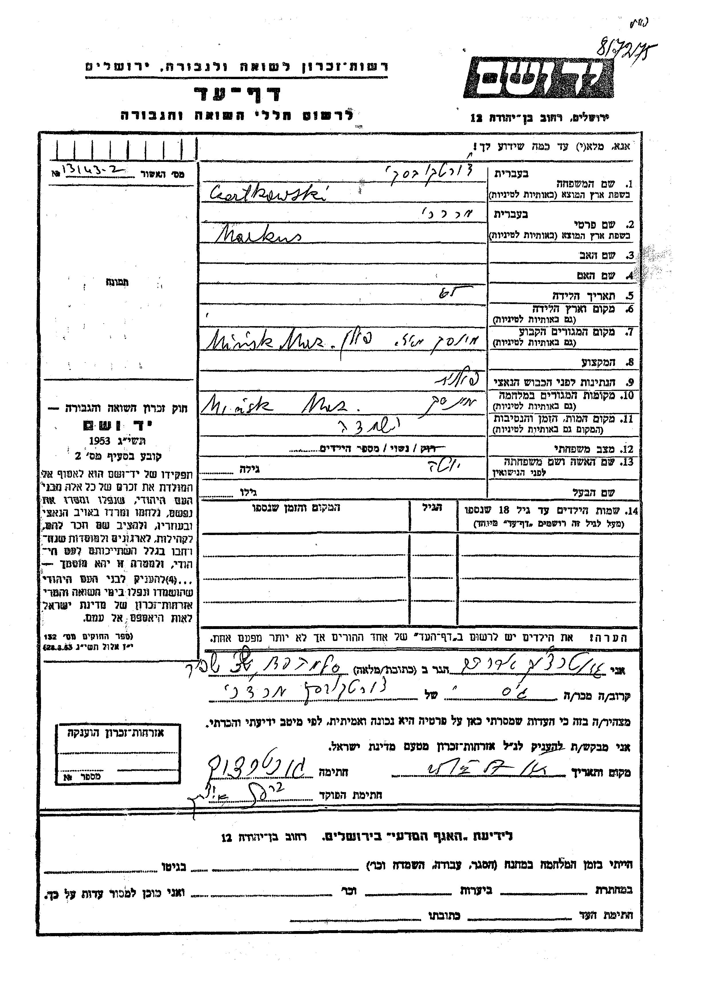Mordekhai Markus Czortkowski. Il était Mariée à Yuta. Avant la seconde guerre mondiale il vivait à Minsk Mazowiecki, Pologne. Au cours de la guerre, il était à Minsk Mazowiecki, Pologne.