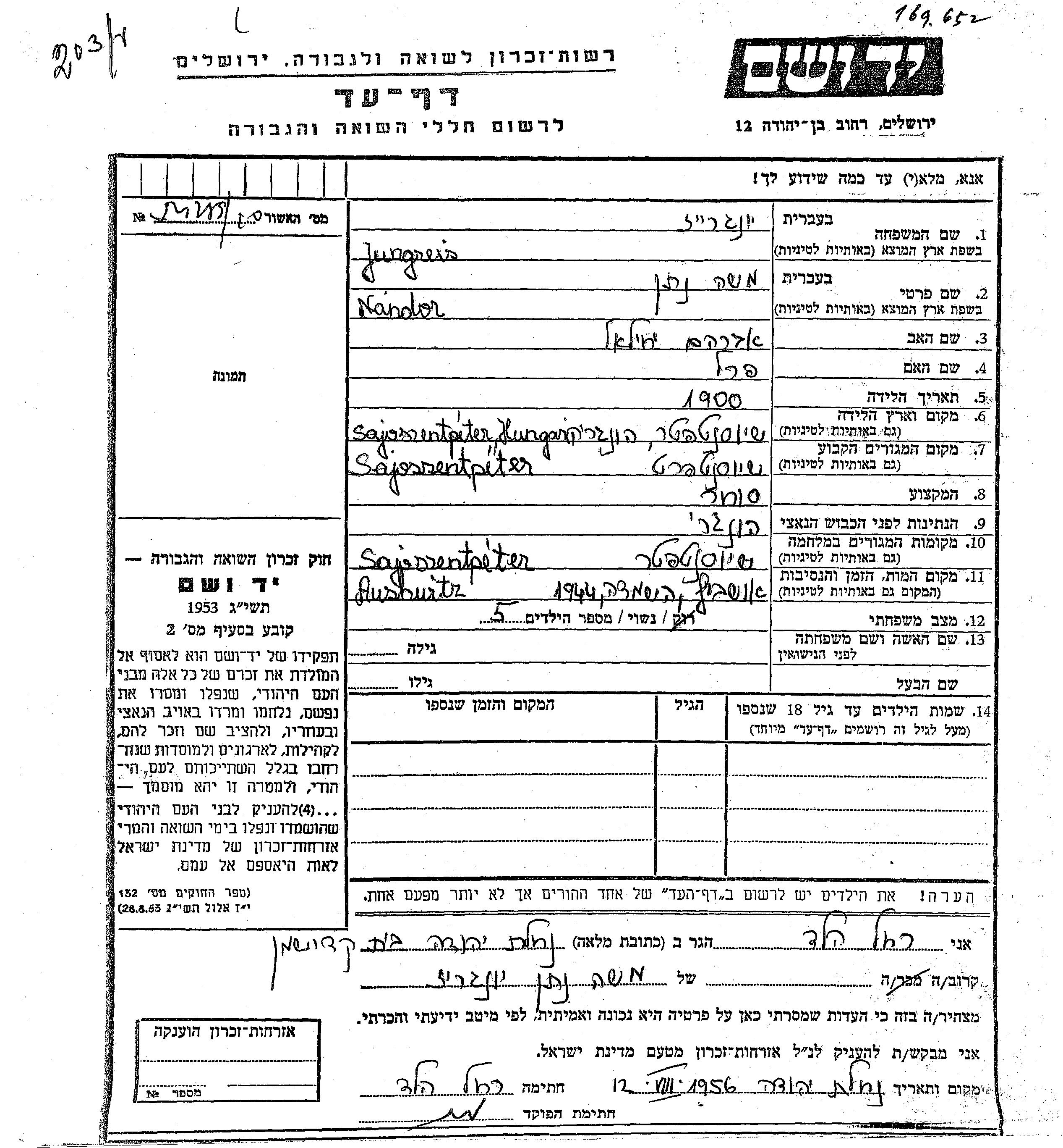 Jungreisz Nandor Moshe Natan 1900 Sajoszentpeter, Hongrie Feuille de témoignage