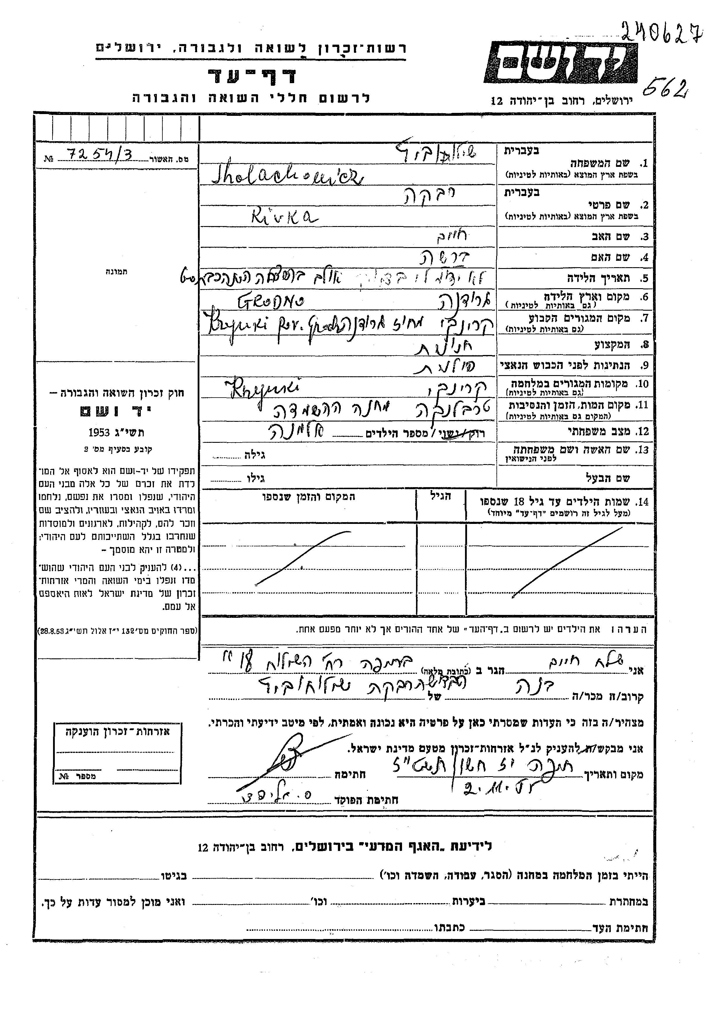Sholachowicz Rivka Krynki, Pologne Feuille de témoignage