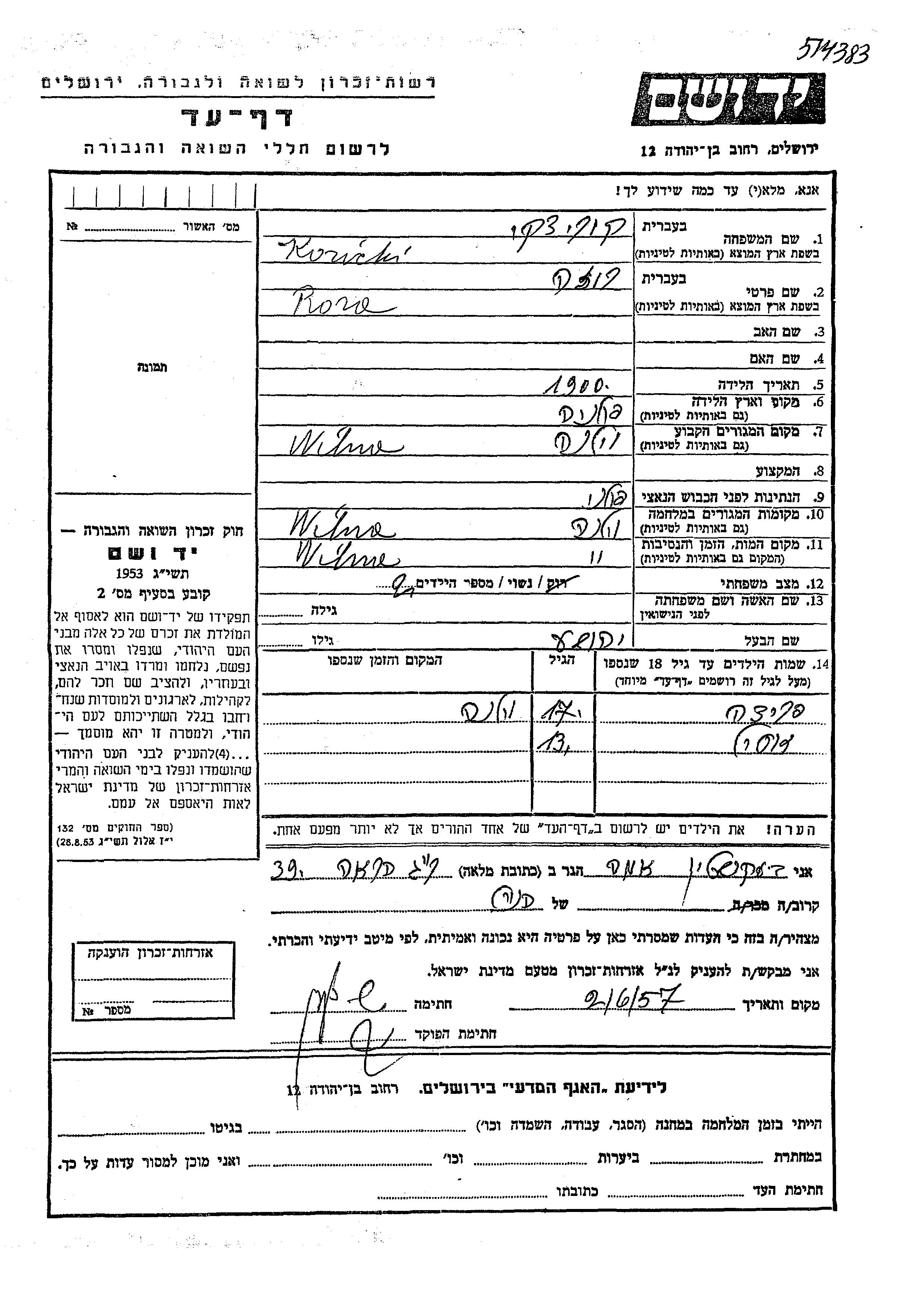 Rosa Koricki Kuritzki est née à Pologne en 1900. Elle était Mariée à Yehoshua. Avant la seconde guerre mondiale elle vivait à Wilna, Pologne. Pendant la guerre, elle était à Wilna, Pologne.