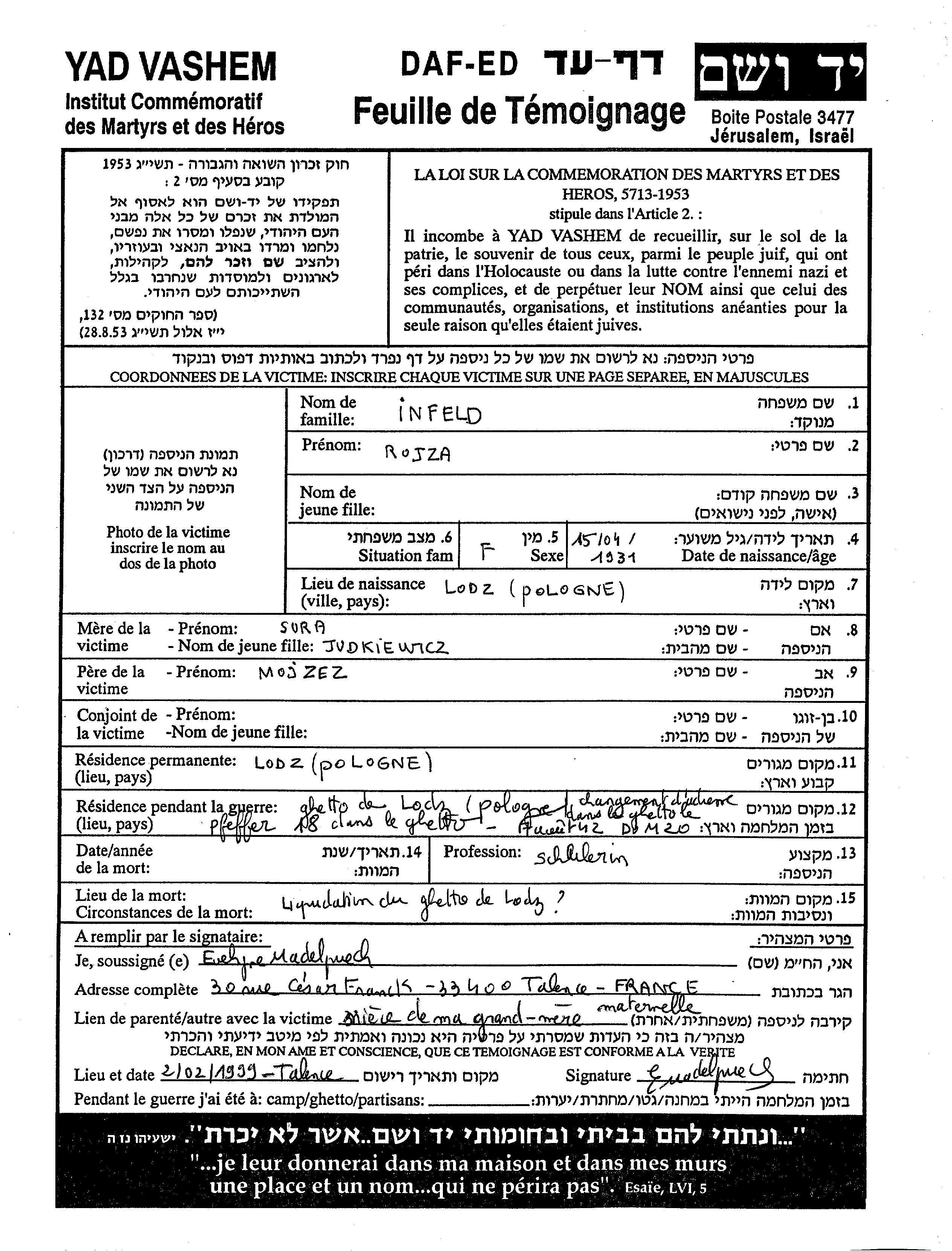 Infeld Rosza 1931 Lodz, Pologne Feuille de témoignage