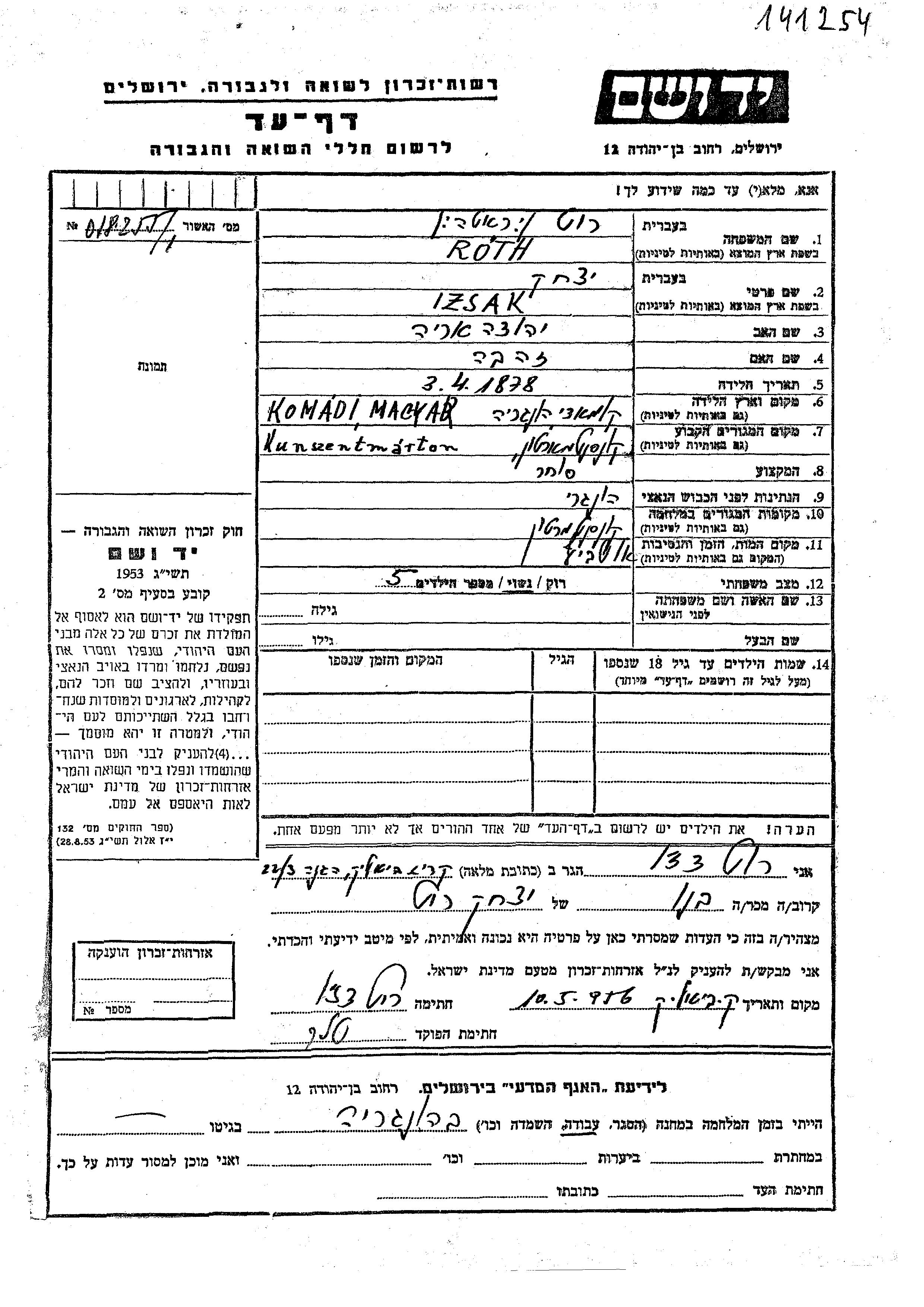 Roth Rut Yitzkhak 1878 Kunszentmarton, Hongrie Feuille de témoignage