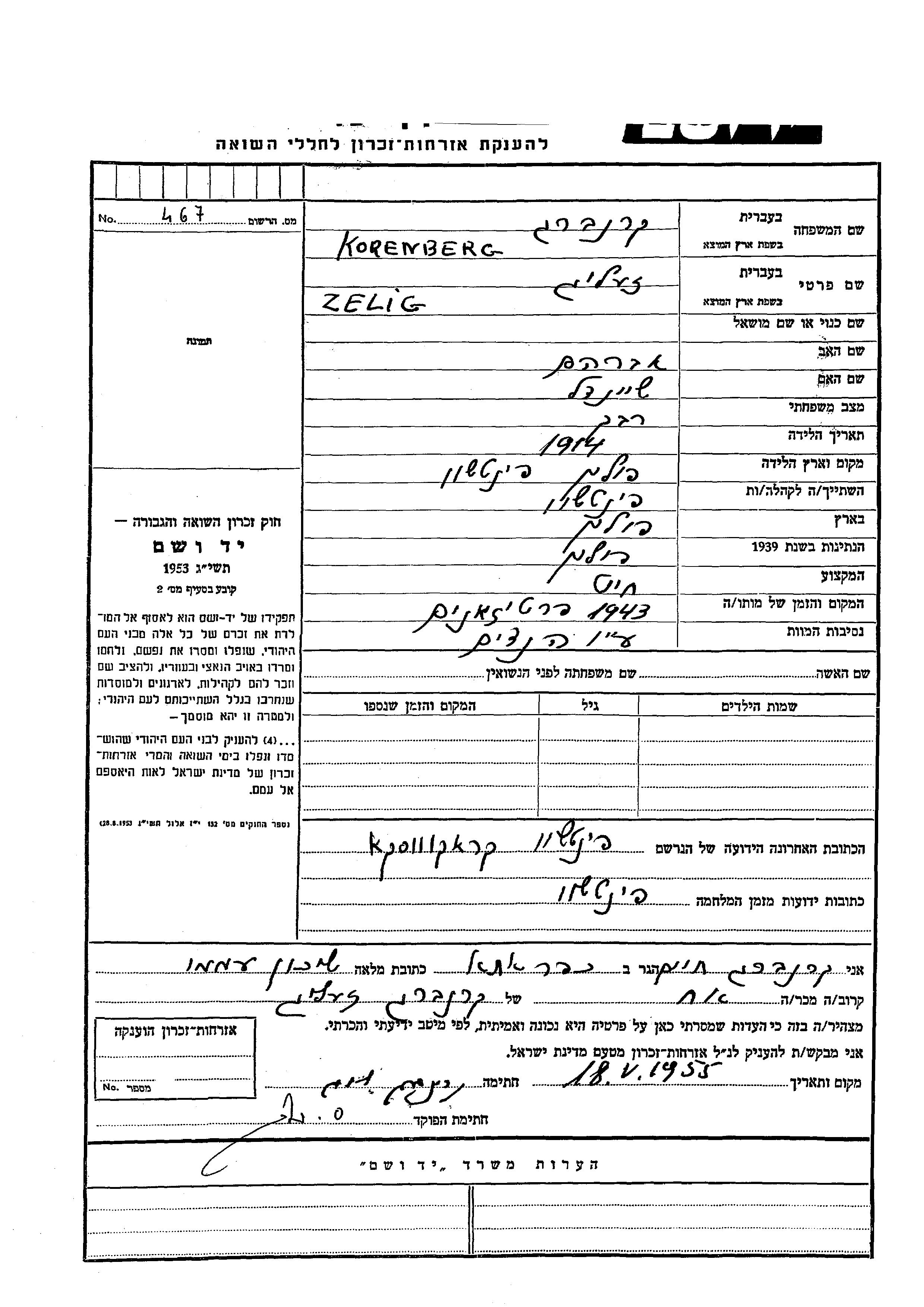 Zelig Korenberg Kernberg est né à Pinczew, Pologne en 1914, fils de Avraham et de Sheindl. Il était Tailleur et Célibataire. Avant la seconde guerre mondiale il vivait à Pinczew, Pologne. Au cours de la guerre, il était à Pinczew, Pologne.