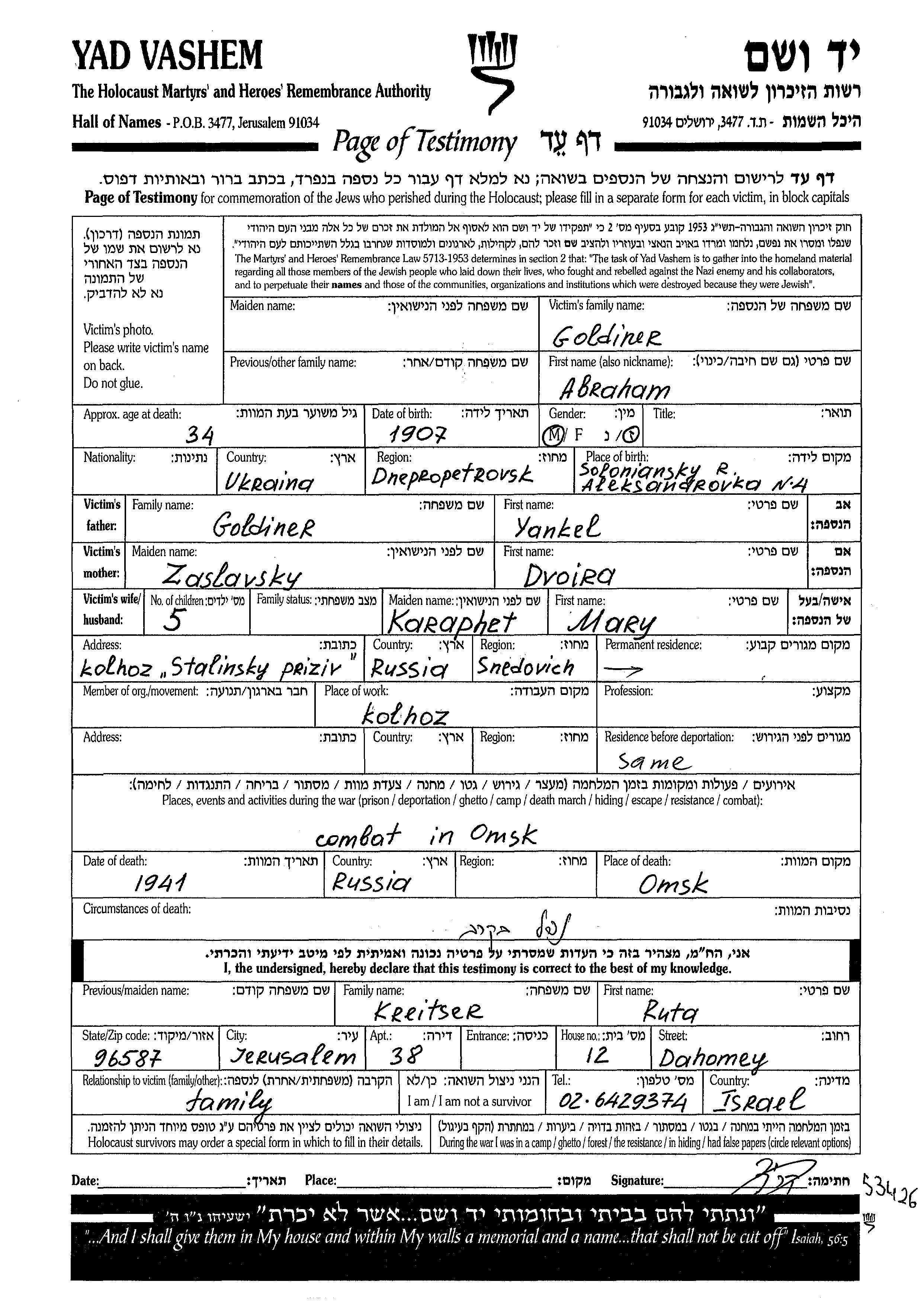 Abraham a été assassiné pendant la Shoah. Lieu de la mort: Omsk, Russie (URSS) en 1941.