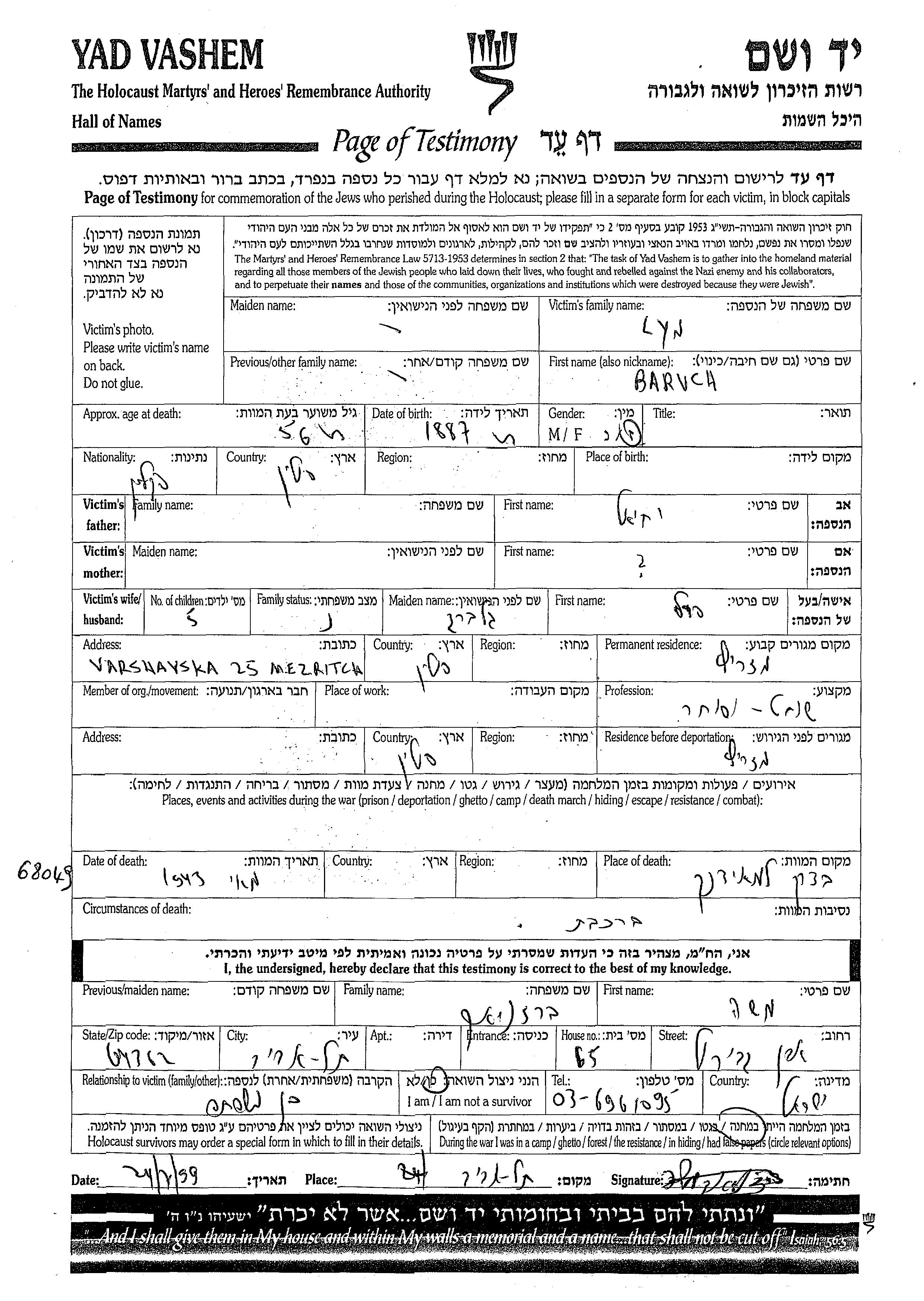 Baruch Lyn est né à Pologne en 1887, fils de Yekhiel. Il était Abatteur rituel et Mariée à Perel née Gelberg. Avant la seconde guerre mondiale il vivait à Mezricz, Pologne. Au cours de la guerre, il était à Mezricz, Pologne.