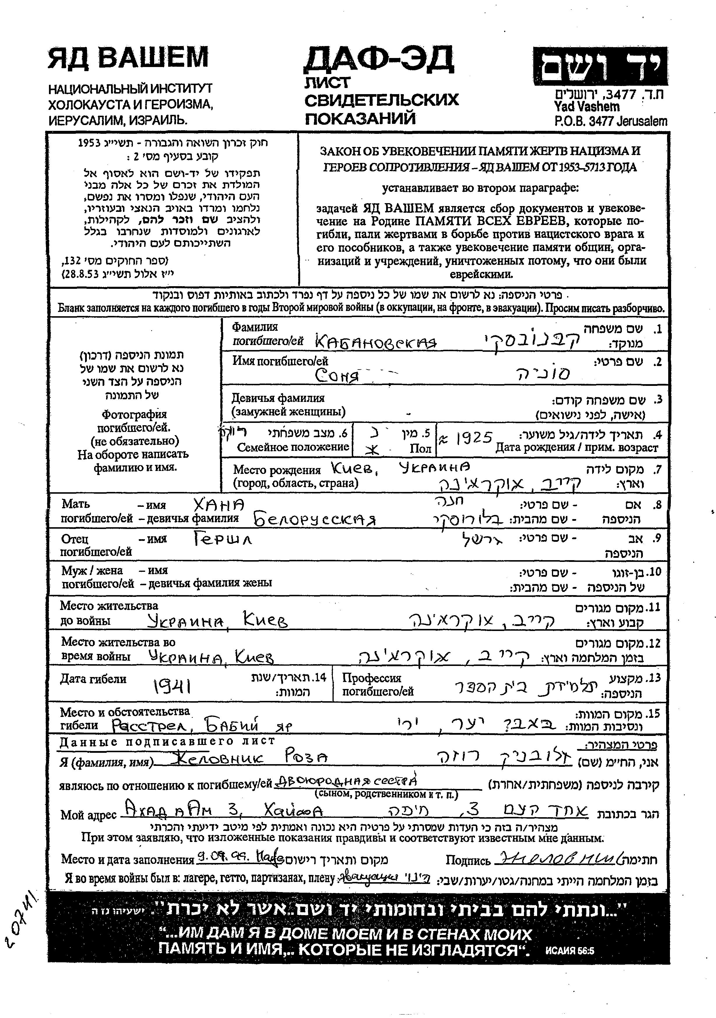 Kabanovskaya Sonia 1925 Kiev, Ukraine (URSS) Feuille de témoignage