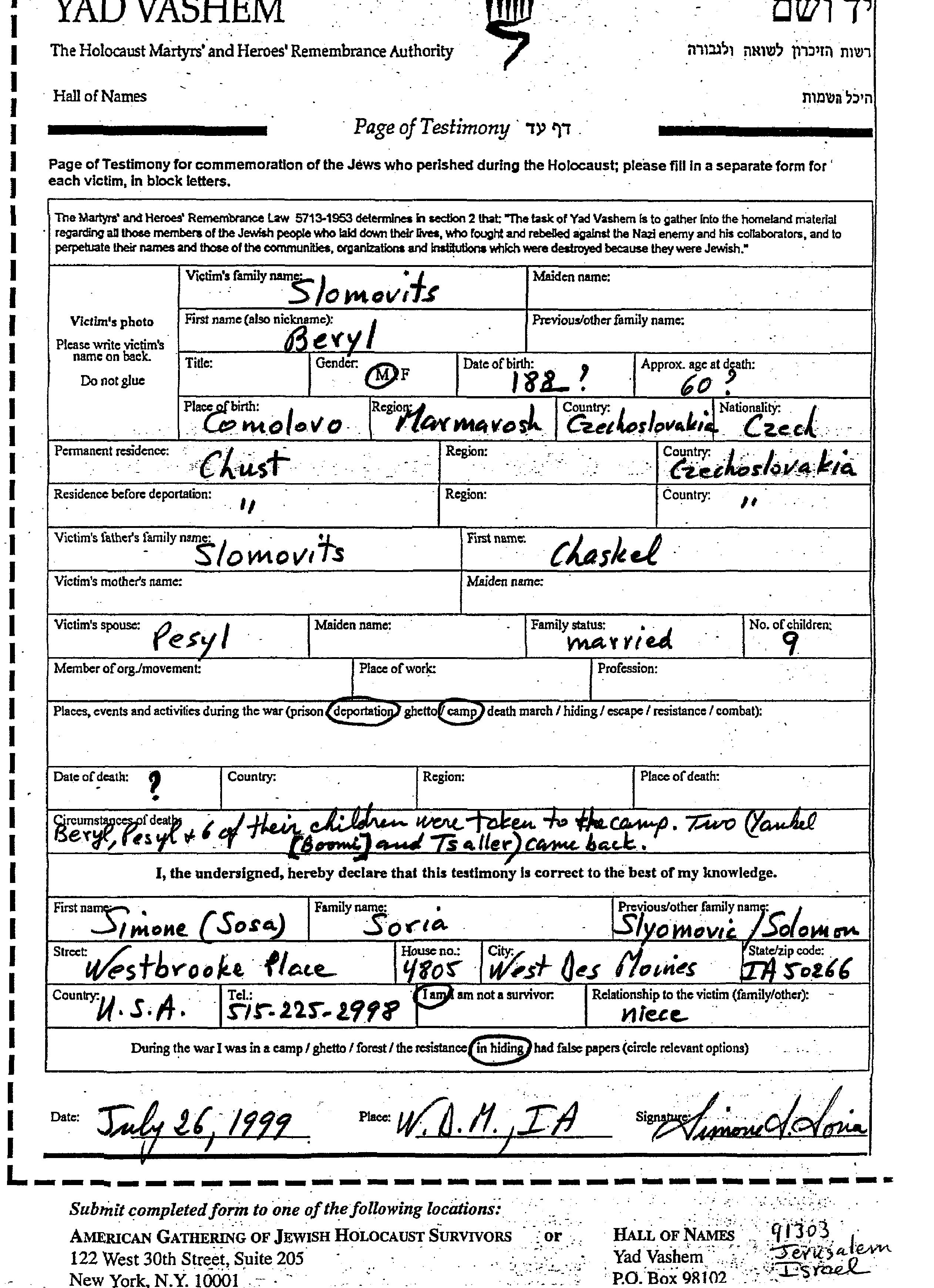 Slomovits Beryl 1880 Chust, Tchécoslovaquie Feuille de témoignage