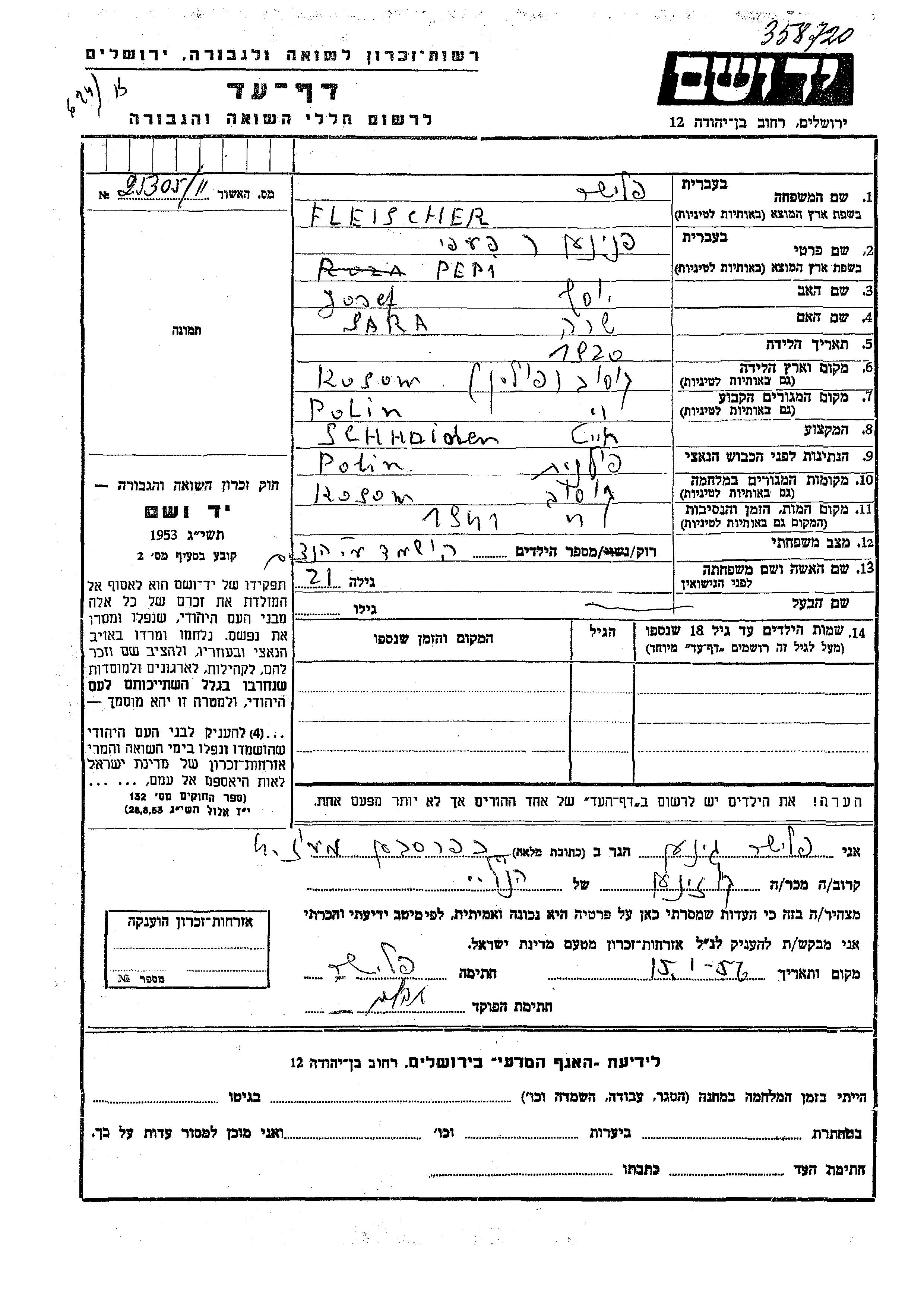 Fleischer Felisher Pepi Pnina 1920 Kosow, Pologne Feuille de témoignage
