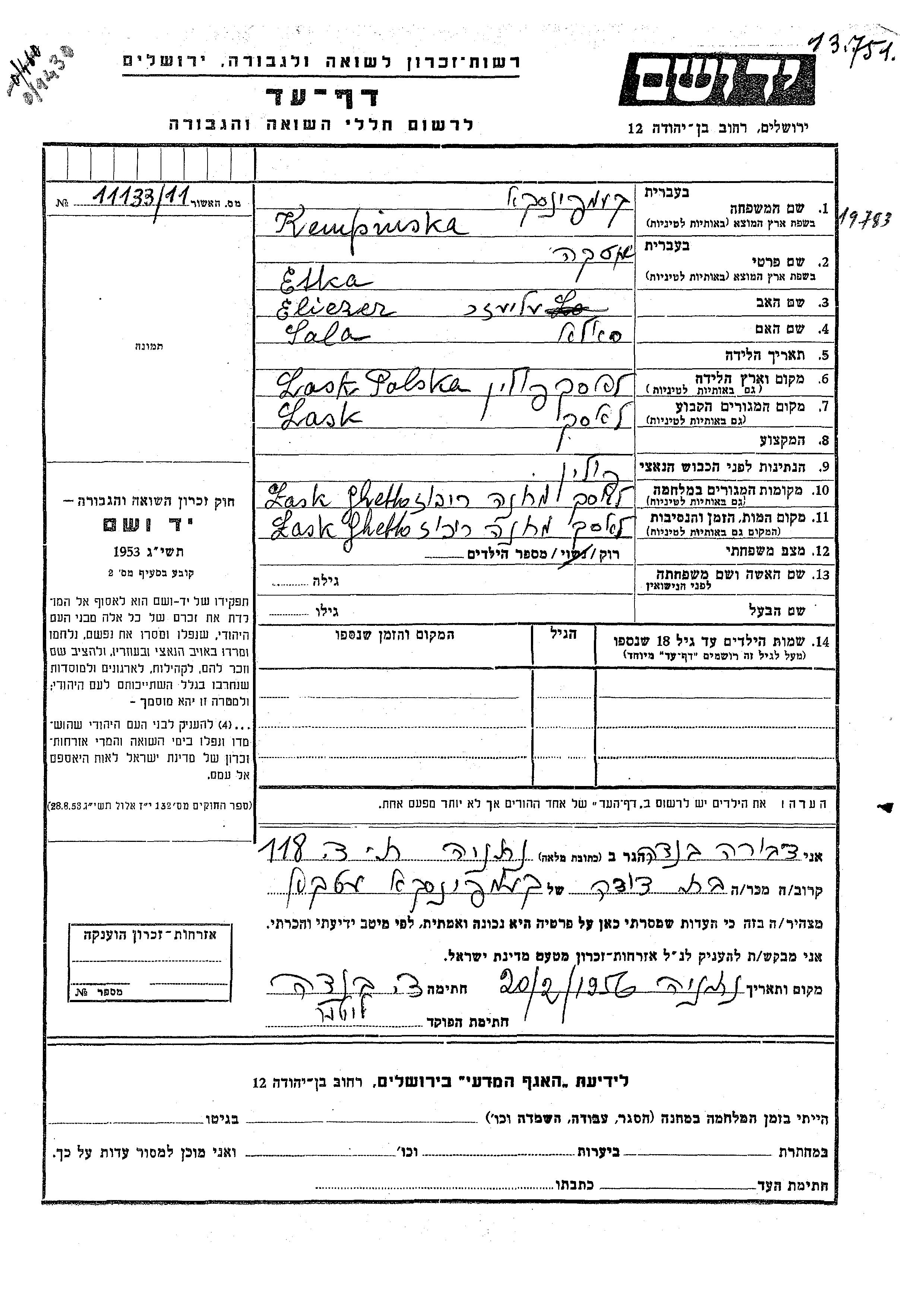 Kempinska Elka Lask, Pologne Feuille de témoignage