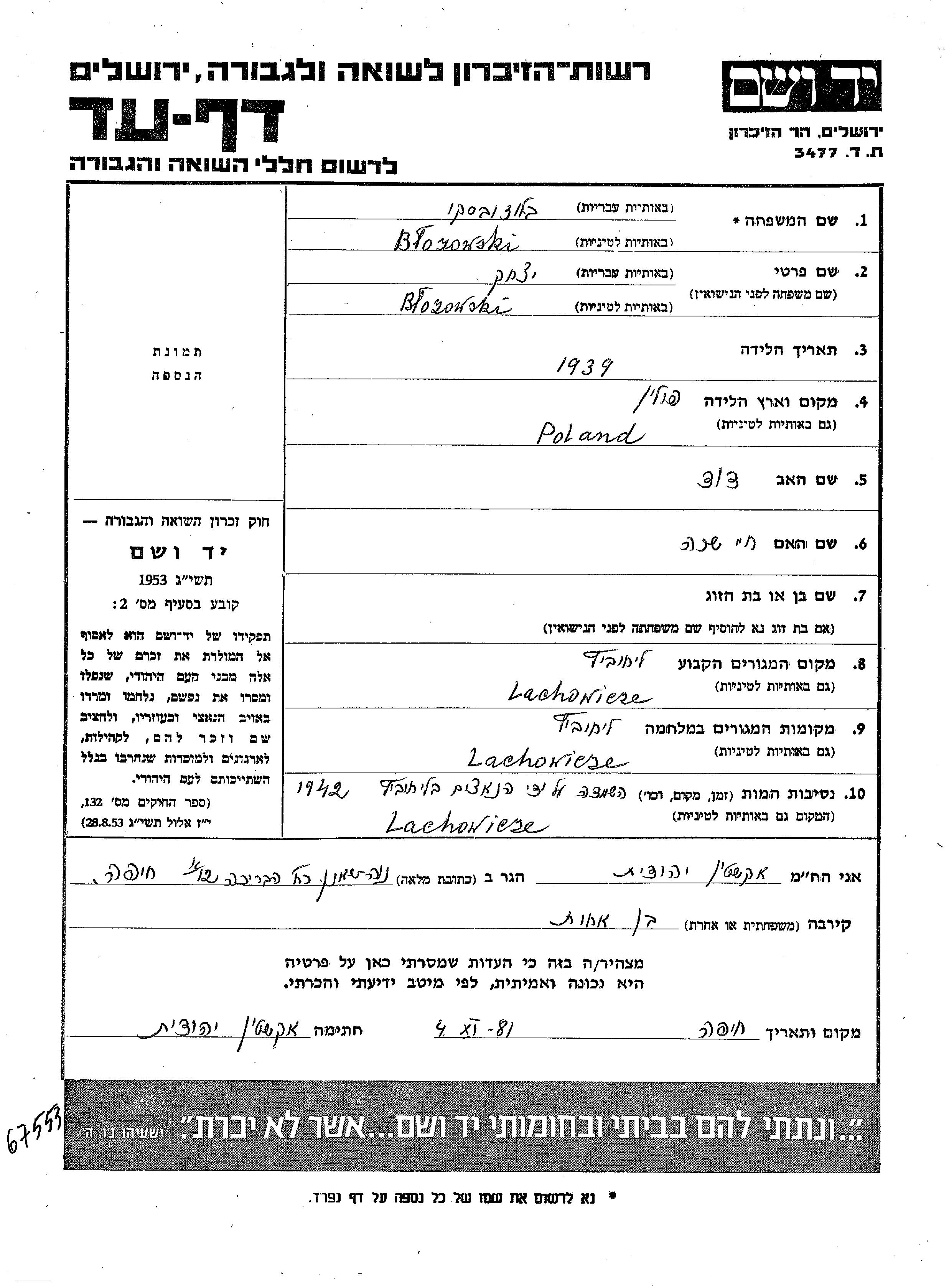 Blozowski Bluzovski Yitzkhak 1939 Lachowicze, Pologne Feuille de témoignage