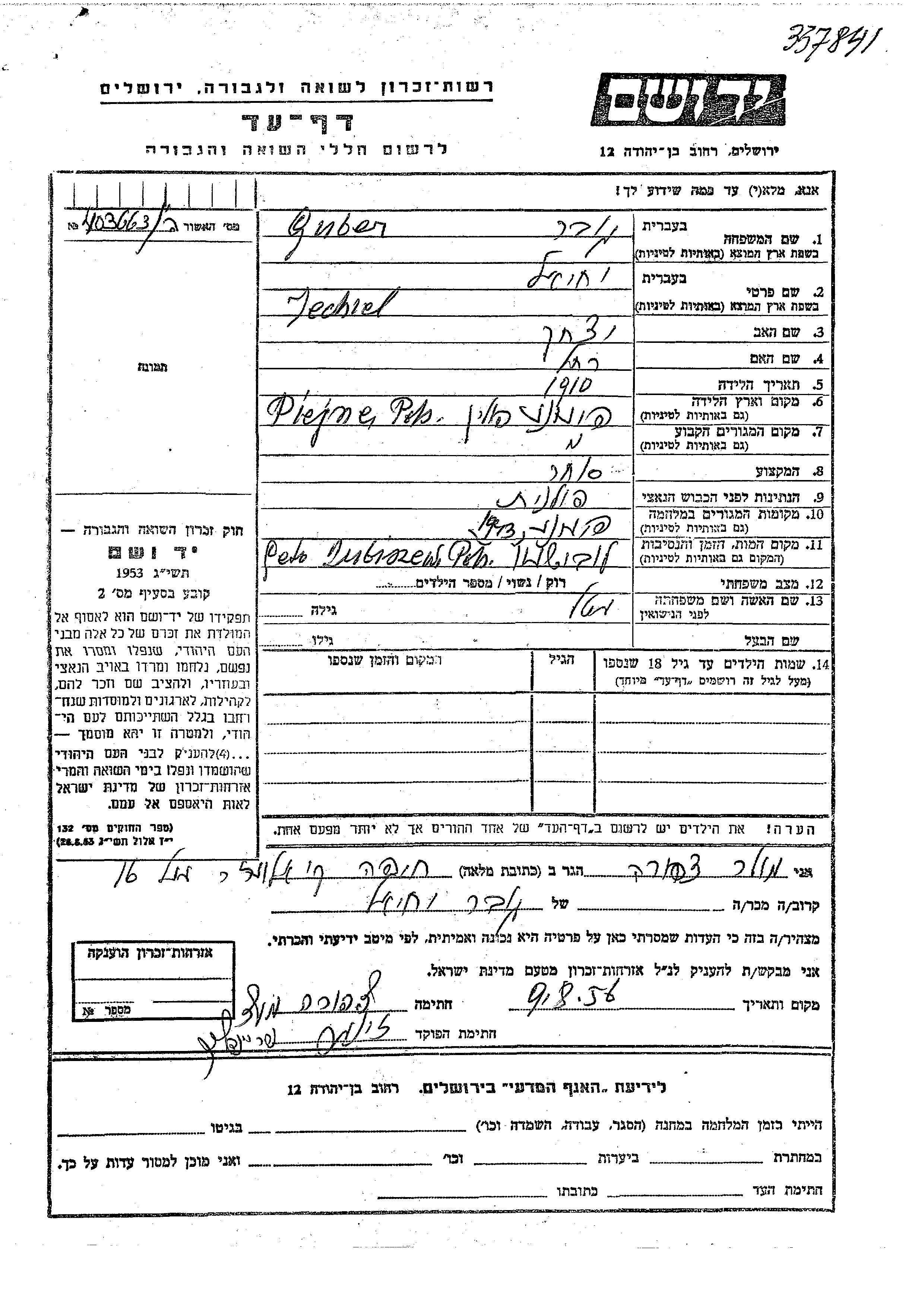Guber Jechiel 1910 Pjanie, Pologne Feuille de témoignage