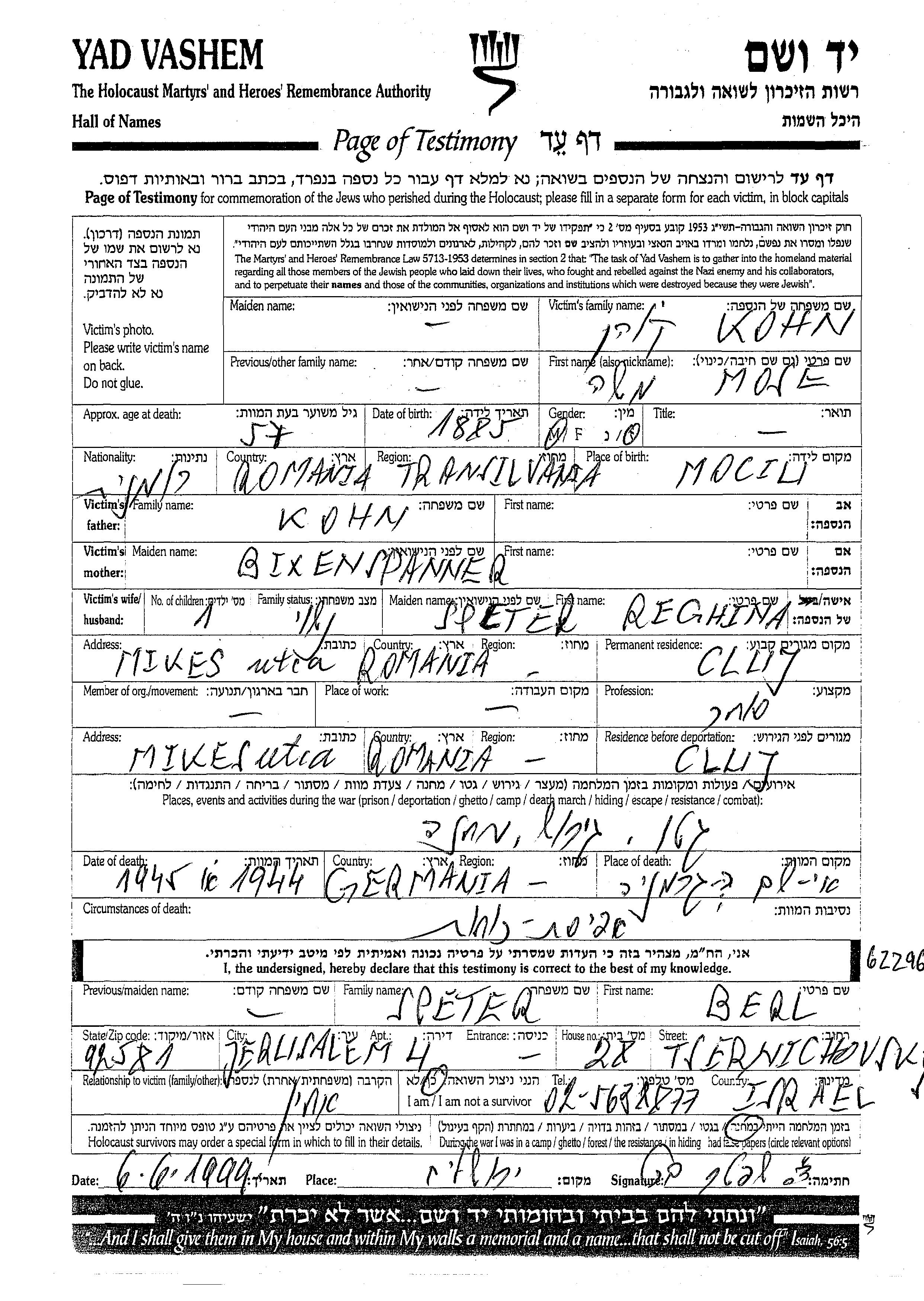 Mose Kohn est né à Mociu, Roumanie en 1885. Il était Commerçant/e et Mariée à Regina née Speter. Avant la seconde guerre mondiale il vivait à Cluj, Roumanie. Au cours de la guerre, il était à Cluj, Roumanie.