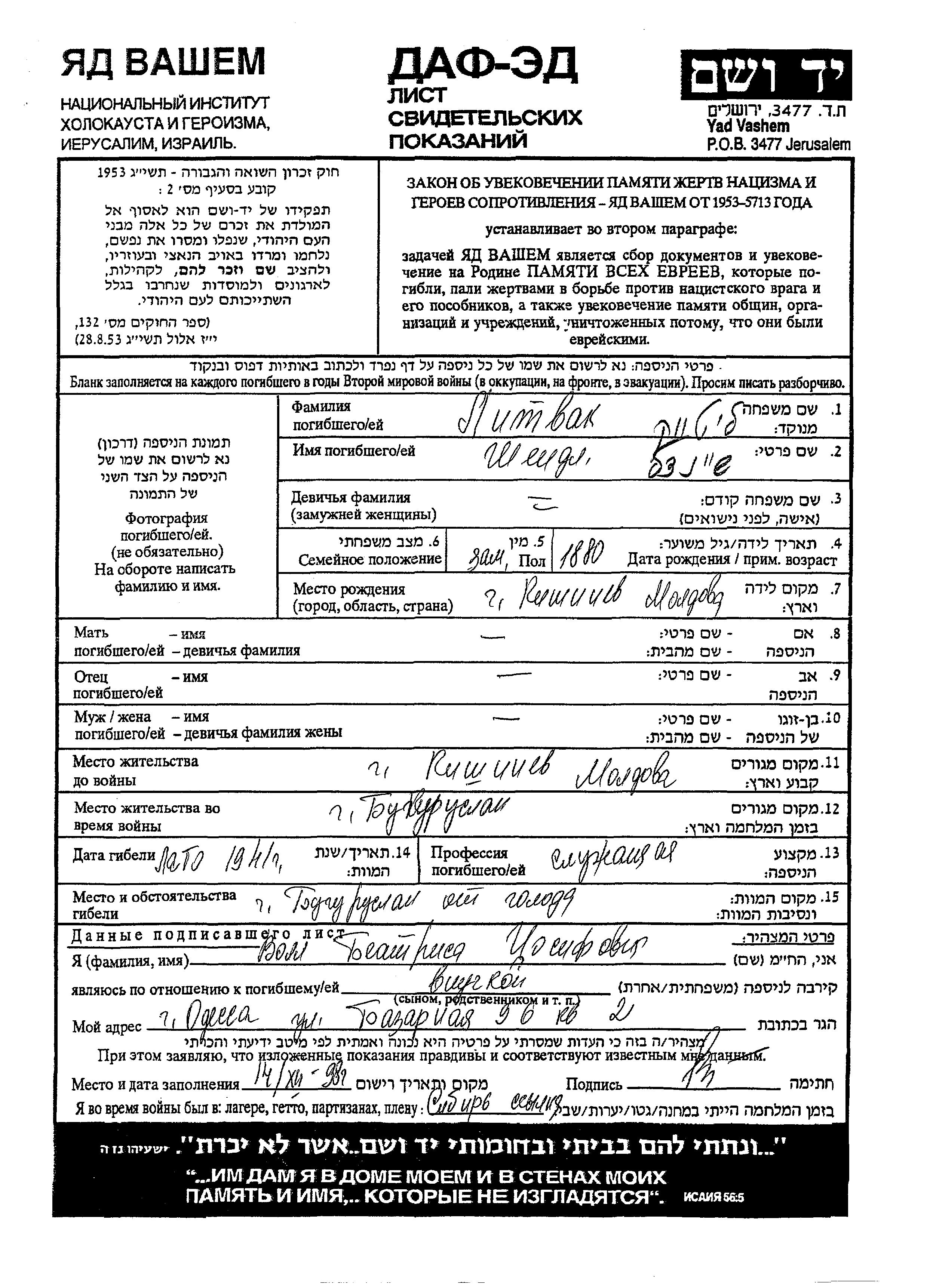Yad Vashem - Pages of Testimony Names Memorial Collection