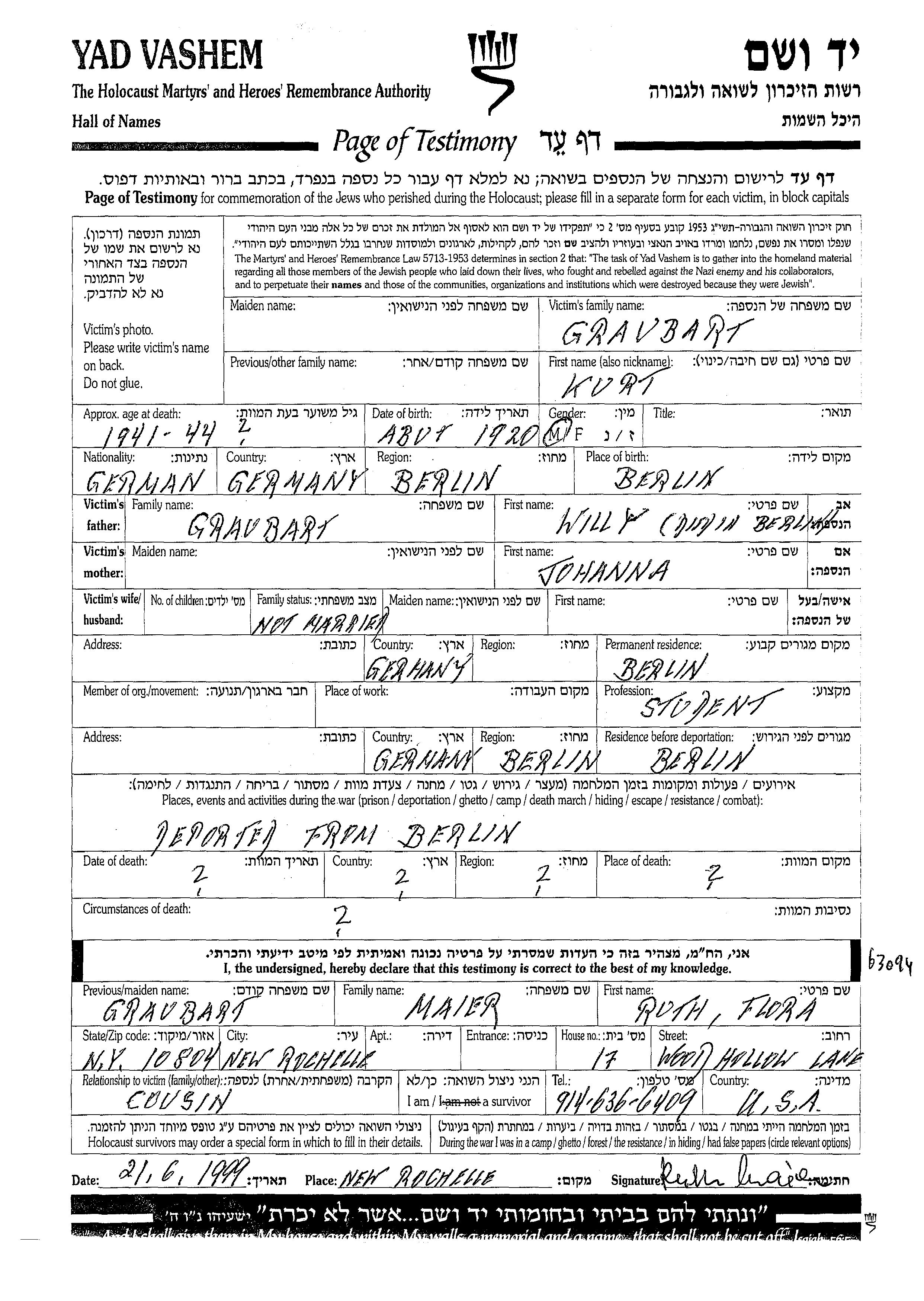 Graubart Kurt 1920 Berlin, Allemagne Feuille de témoignage