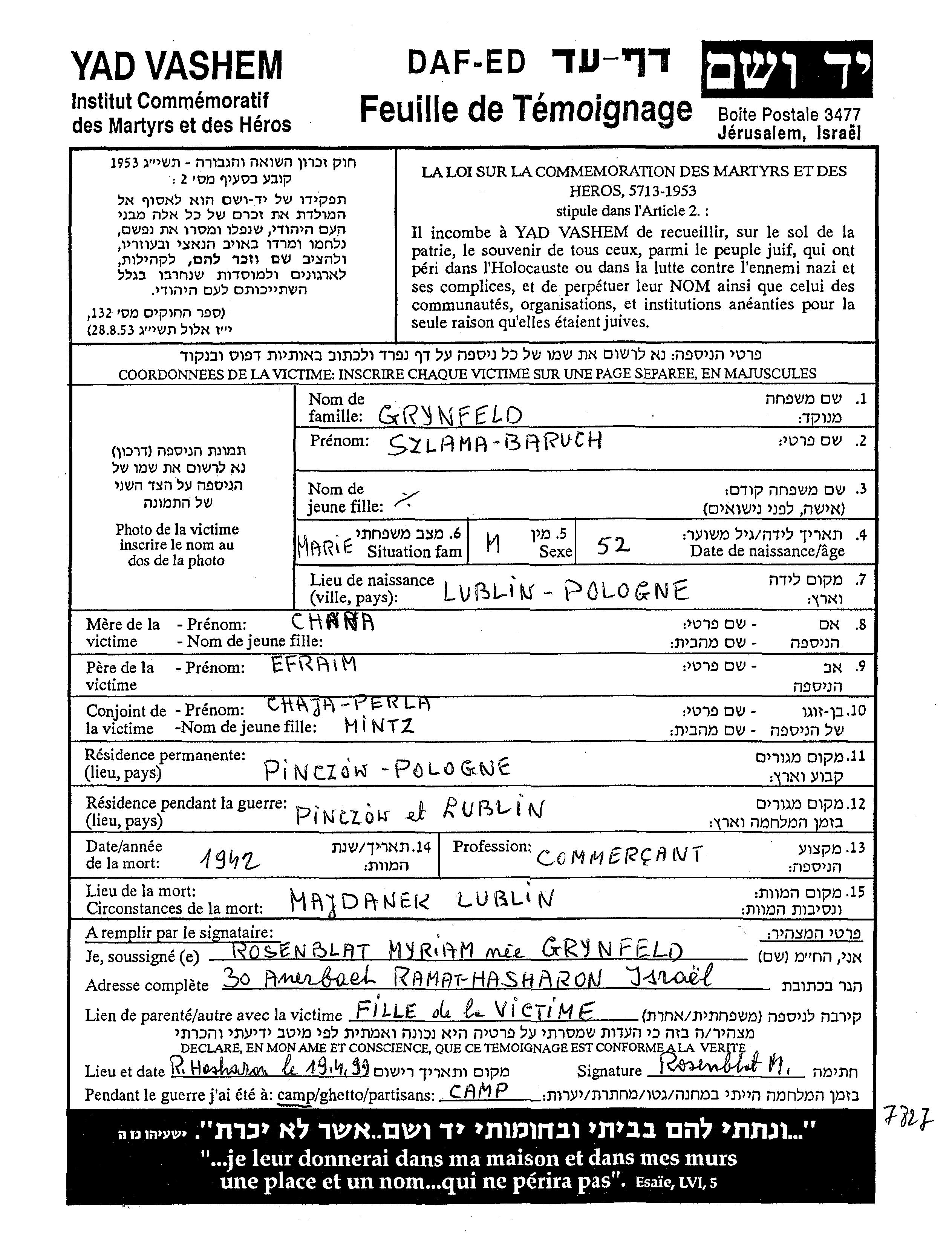 Szlama Baruch Grynfeld Mintz est né à Lublin, Pologne en 1890, fils de Efraim et de Chana. Il était Commerçant/e et Mariée à Chaja Perla. Avant la seconde guerre mondiale il vivait à Pinczow, Pologne. Au cours de la guerre, il était à Pinczow, Pologne.