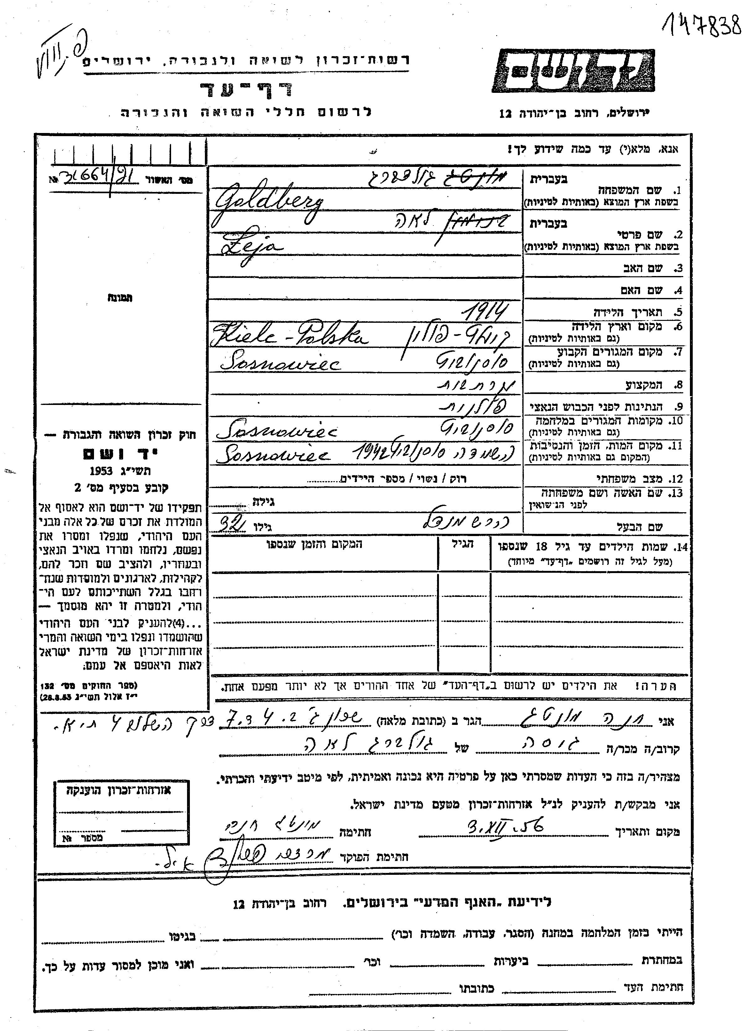 Goldberg Leja 1914 Sosnowiec, Pologne Feuille de témoignage