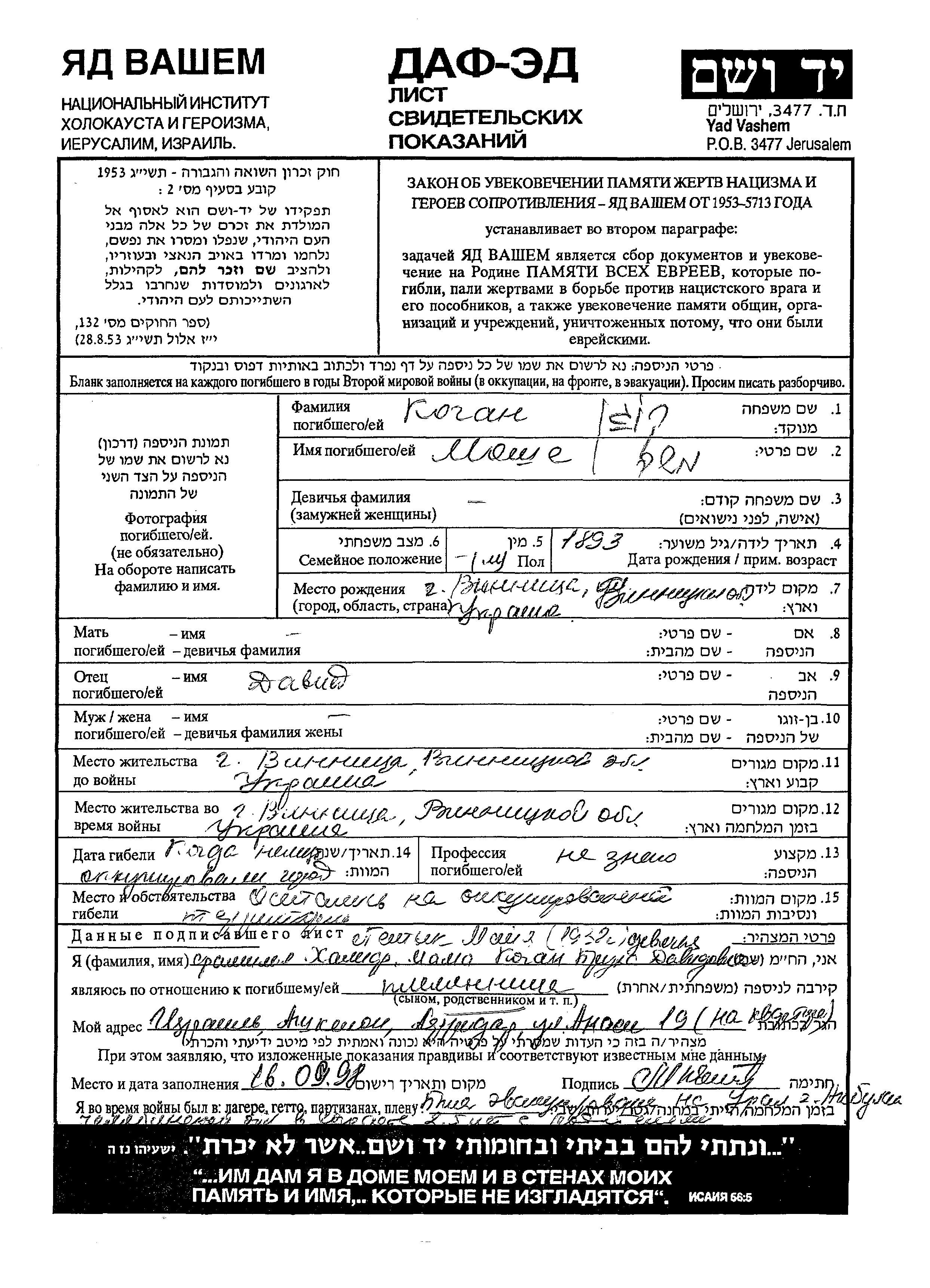 Kogan Moshe 1893 Vinnitsa, Ukraine (URSS) Feuille de témoignage