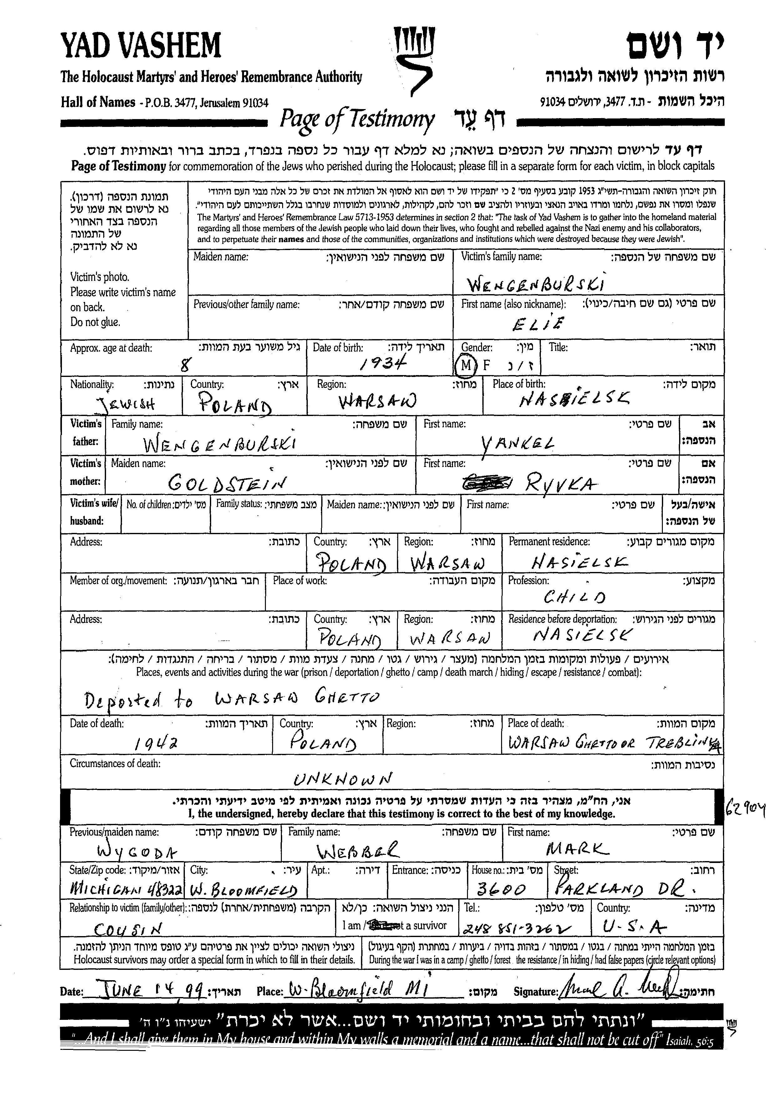 Wengenburski Elie 1934 Nasielsk, Pologne Feuille de témoignage