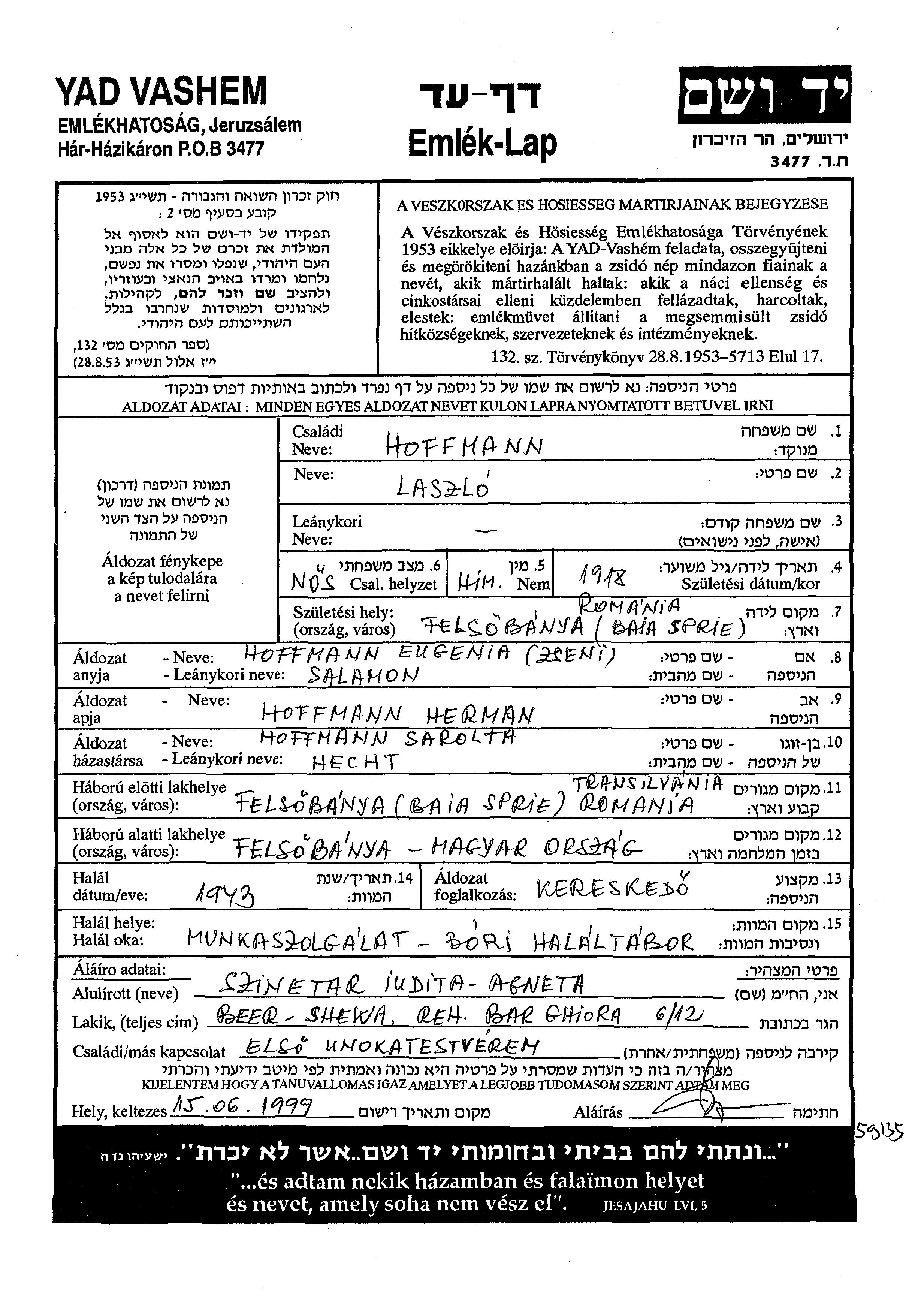 Laszlo Hoffmann est né à Felsobanya, Roumanie en 1918, fils de Herman et de Eugenia née Salamon. Il était Commerçant/e et Mariée à Sarolta née Hecht. Avant la seconde guerre mondiale il vivait à Baia Sprie, Roumanie. Au cours de la guerre, il était à Felsobanya, Roumanie.