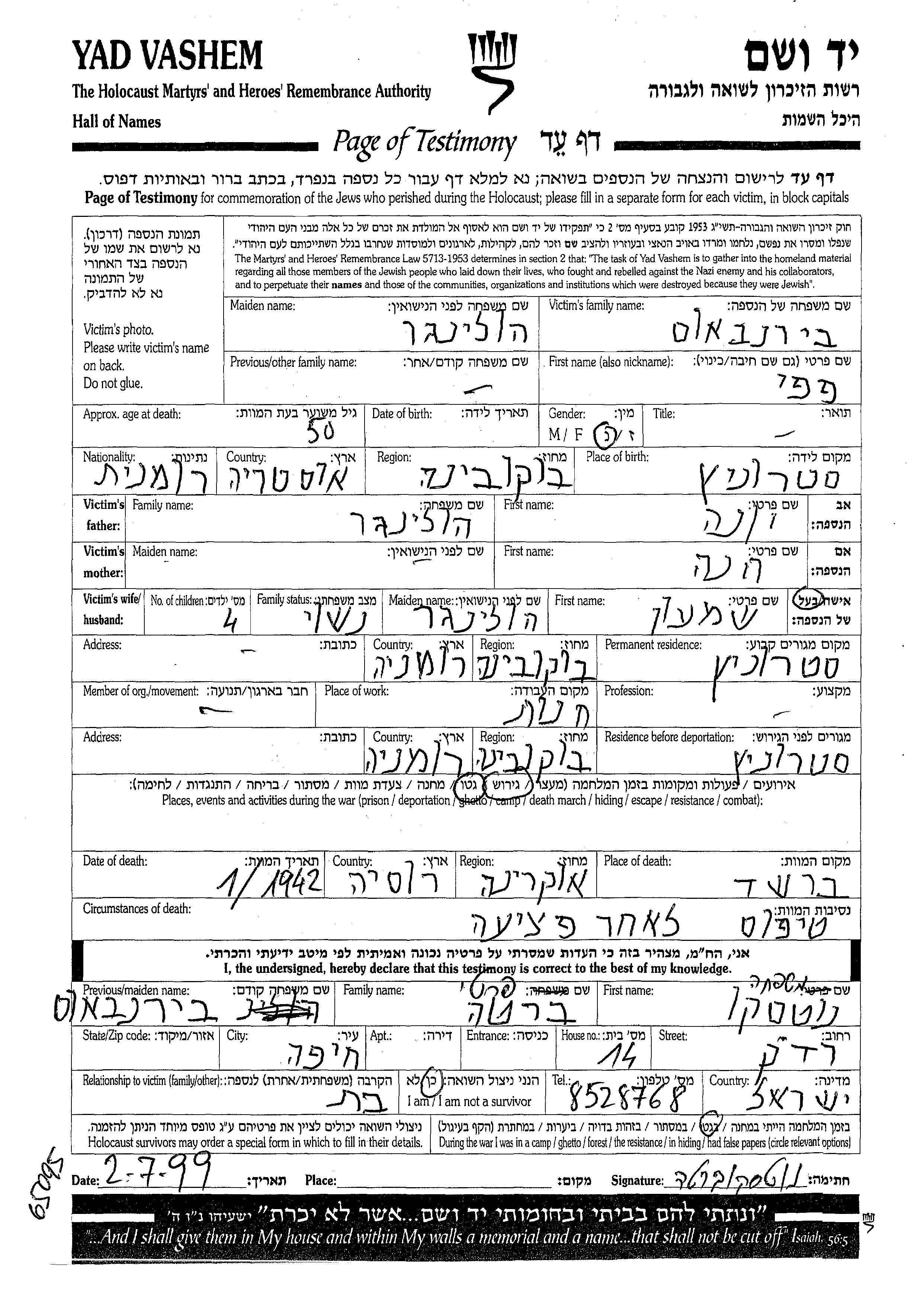 Yad Vashem - Pages of Testimony Names Memorial Collection