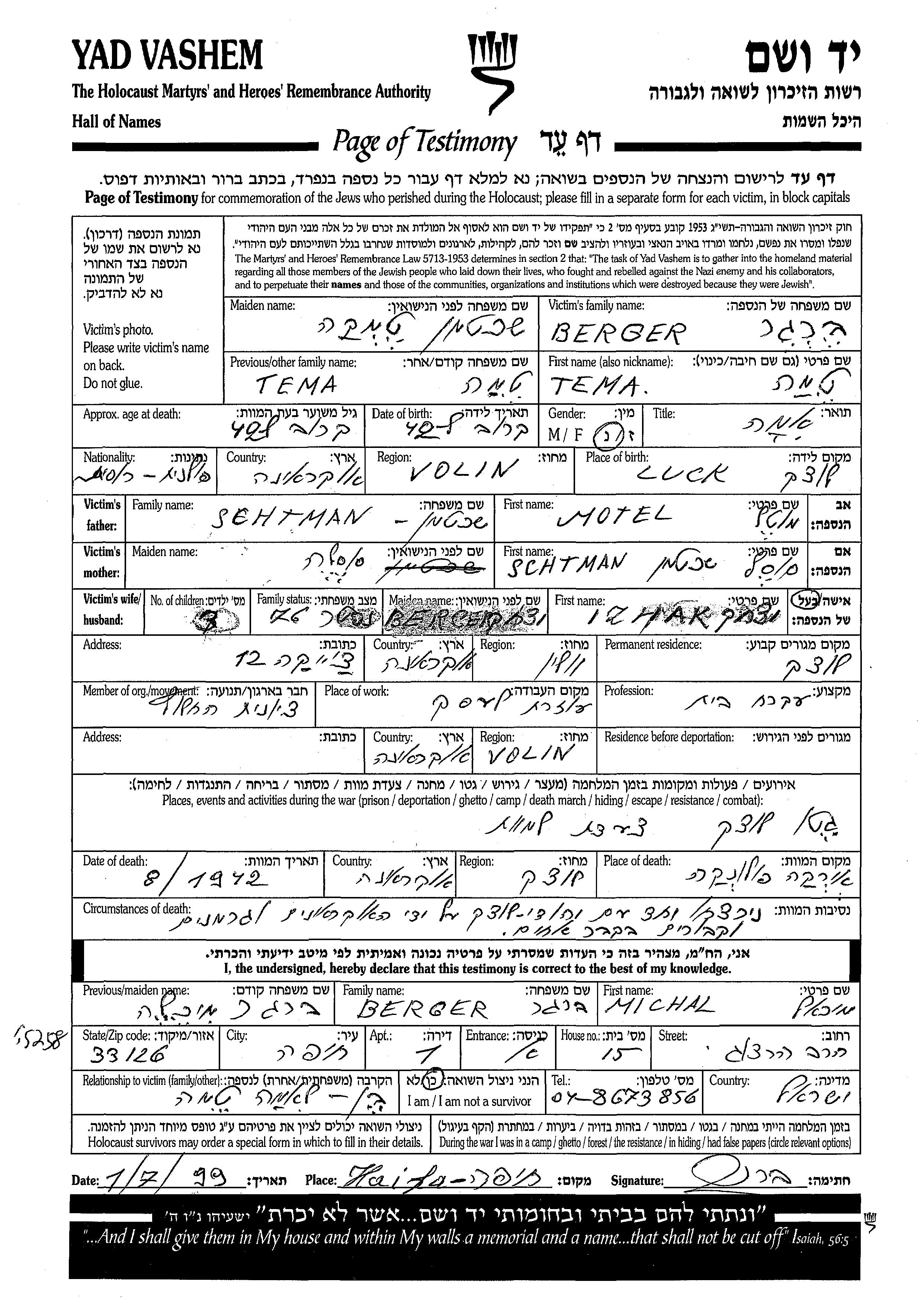Tema Berger née Shekhtman est née à Luck, Pologne, fille de Motel. Elle était Femme au foyer et Mariée à Izhak. Avant la seconde guerre mondiale elle vivait à Luck, Pologne. Pendant la guerre, elle était à Wolyn, Pologne.