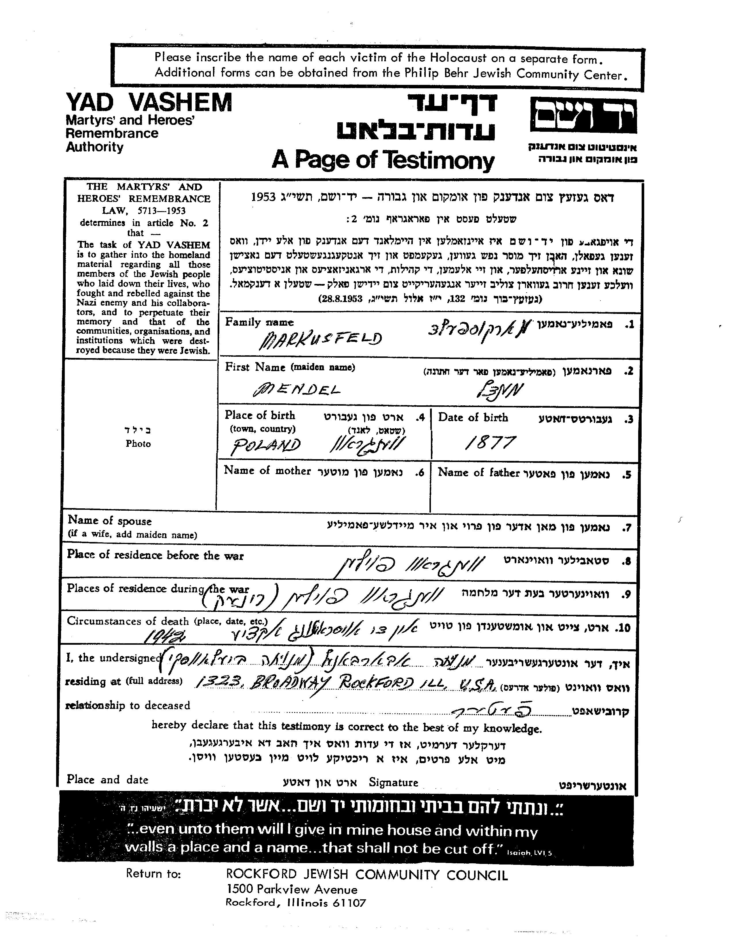 Markusfeld Mendel 1877 endroit inconnu, Feuille de témoignage