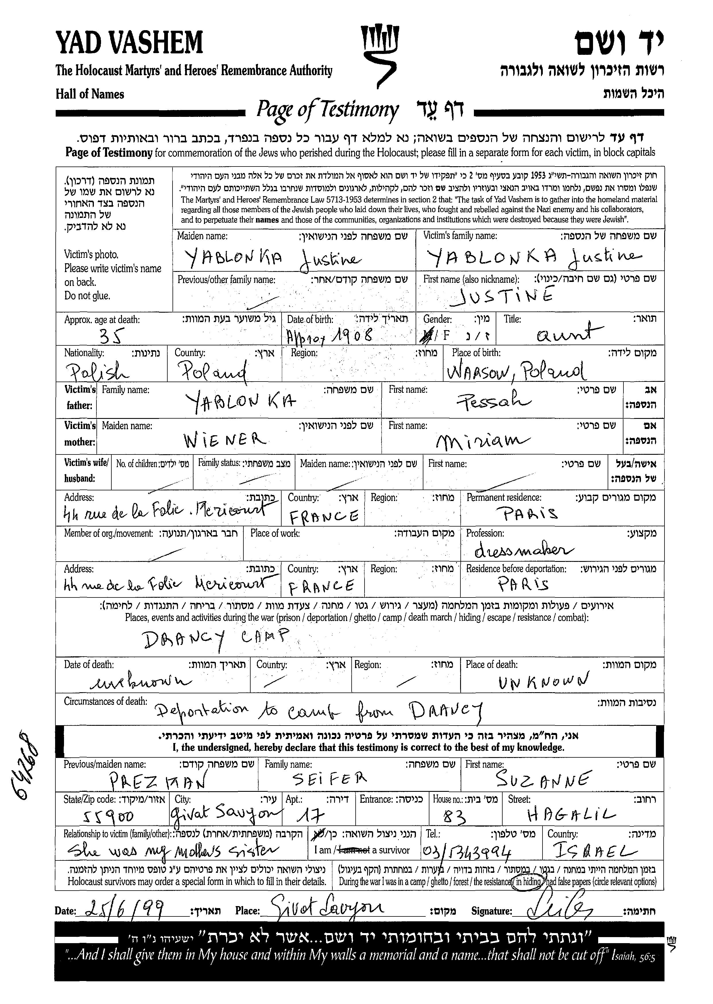 Yablonka Justine 1908 Paris, France Feuille de témoignage