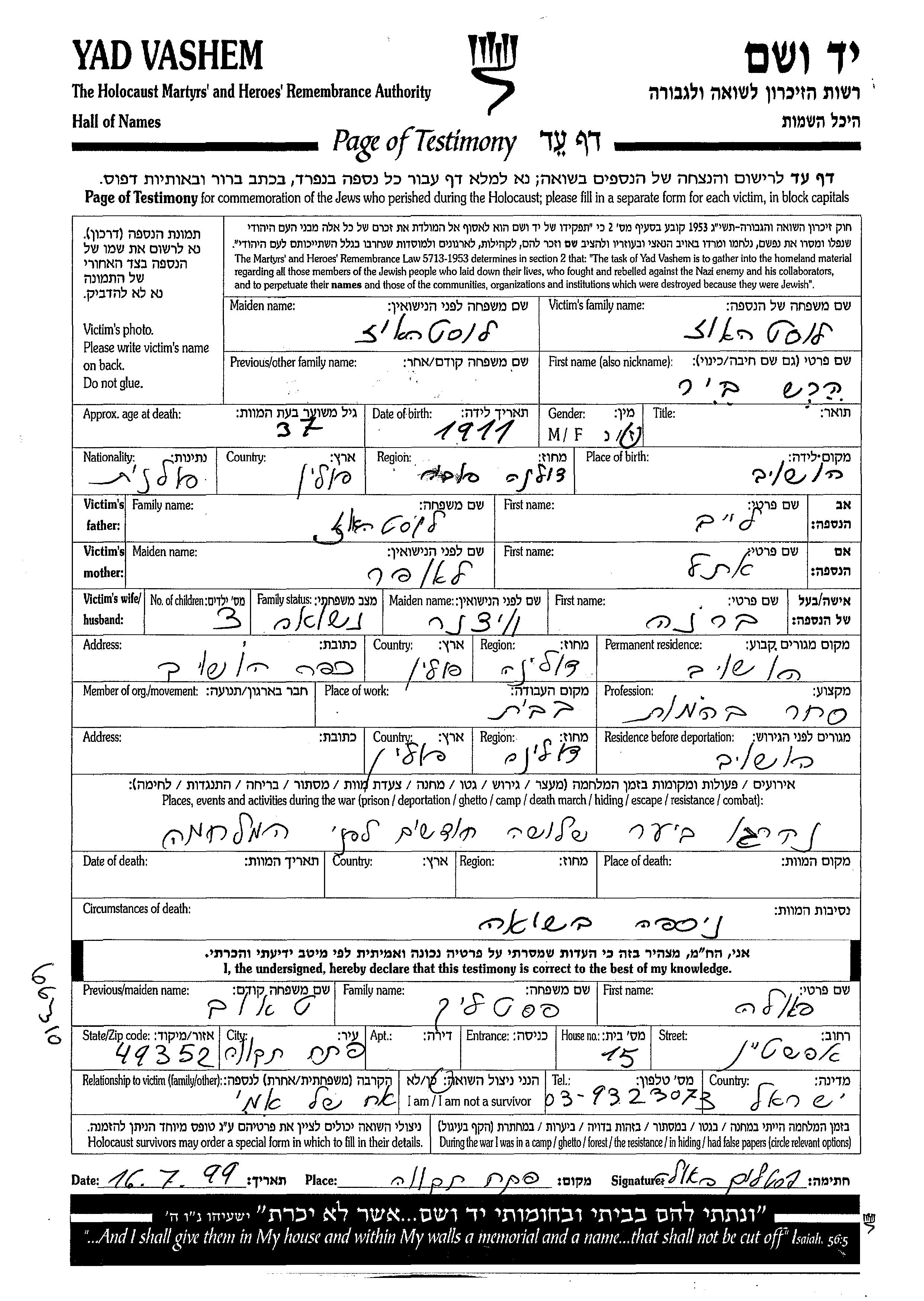 Yad Vashem - Pages of Testimony Names Memorial Collection
