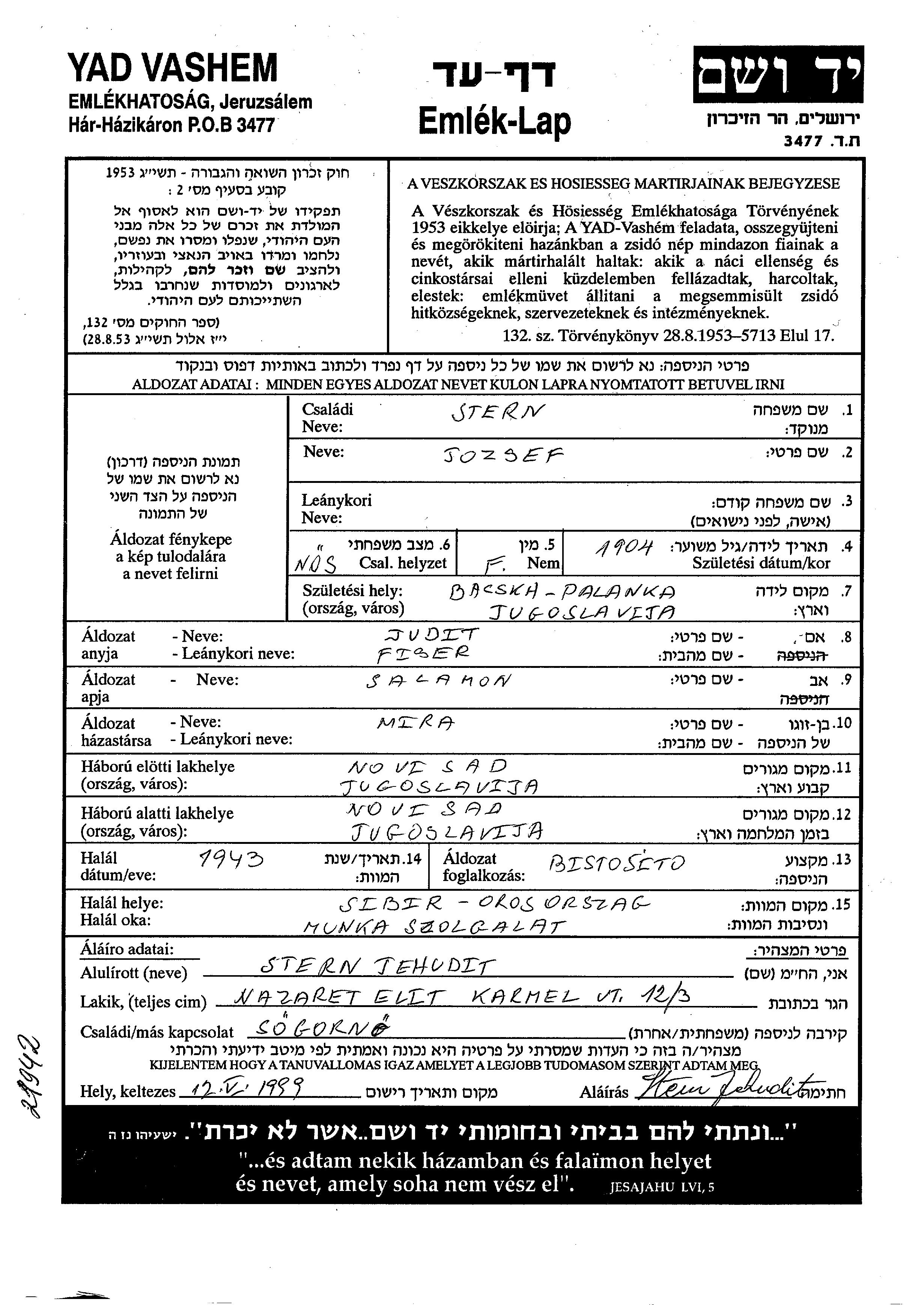 Stern Jozsef 1904 Novi Sad, Yugoslavie Feuille de témoignage