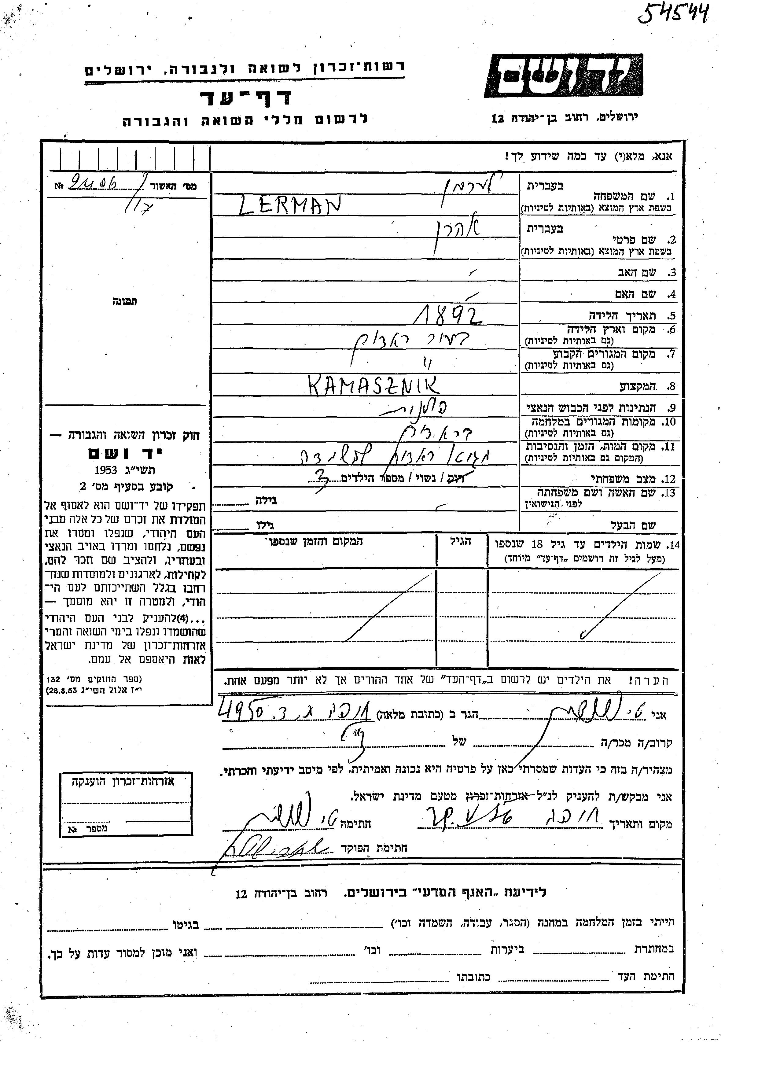 Lerman Aharon 1892 Radom, Pologne Feuille de témoignage