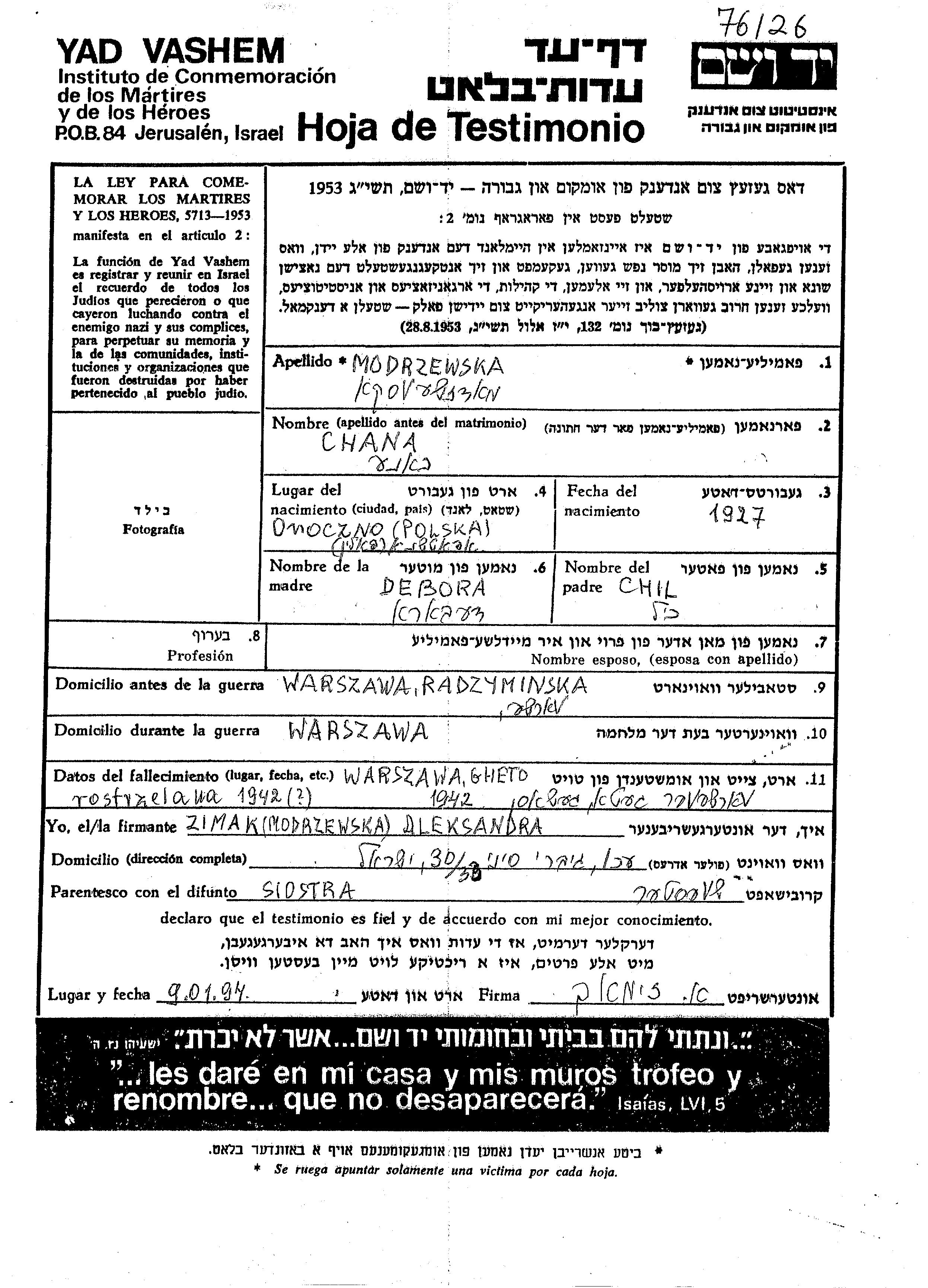 Modrzewski Chana 1927 Warszawa, Pologne Feuille de témoignage