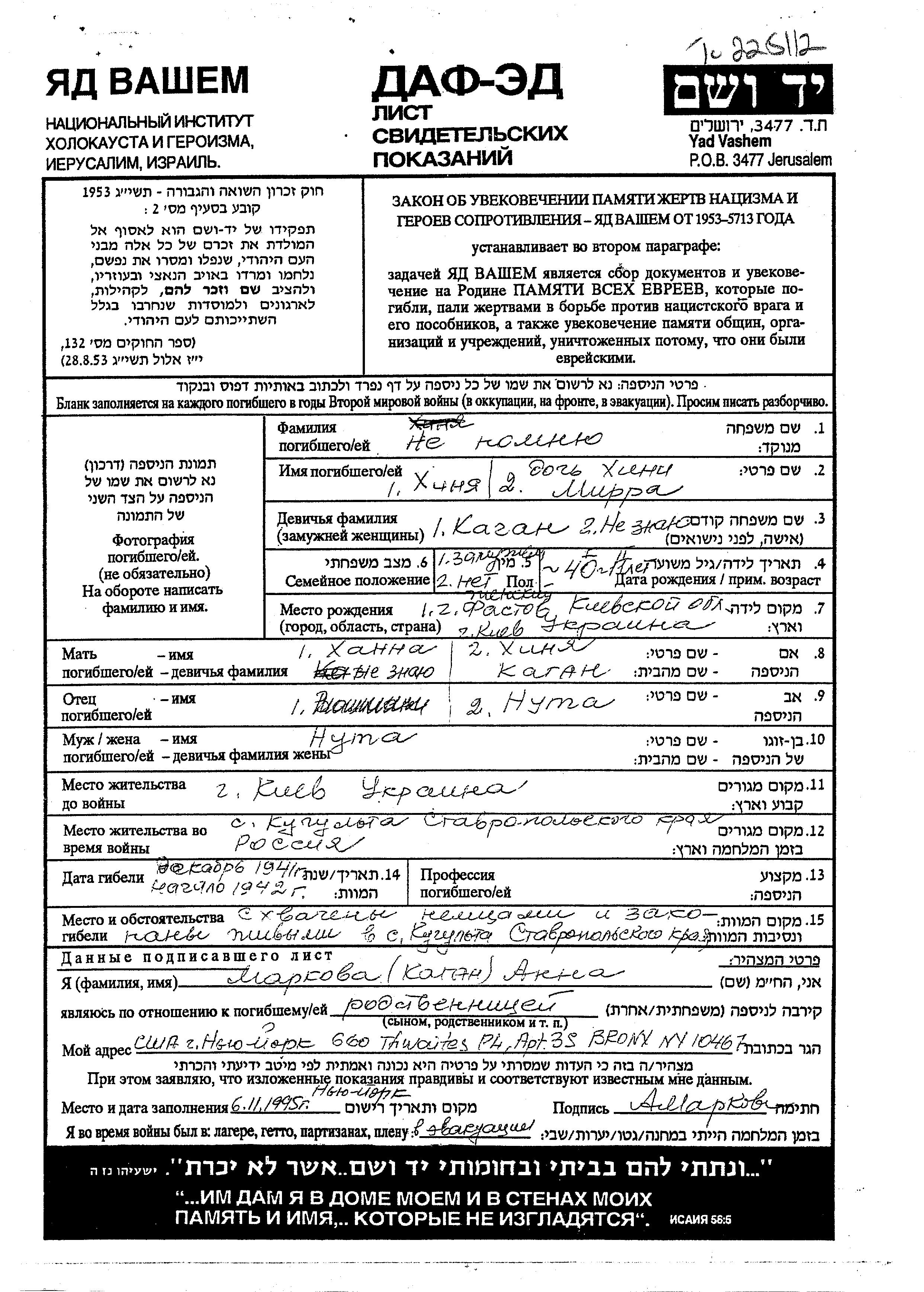 nom inconnu Mirra Kiev, Ukraine (URSS) Feuille de témoignage