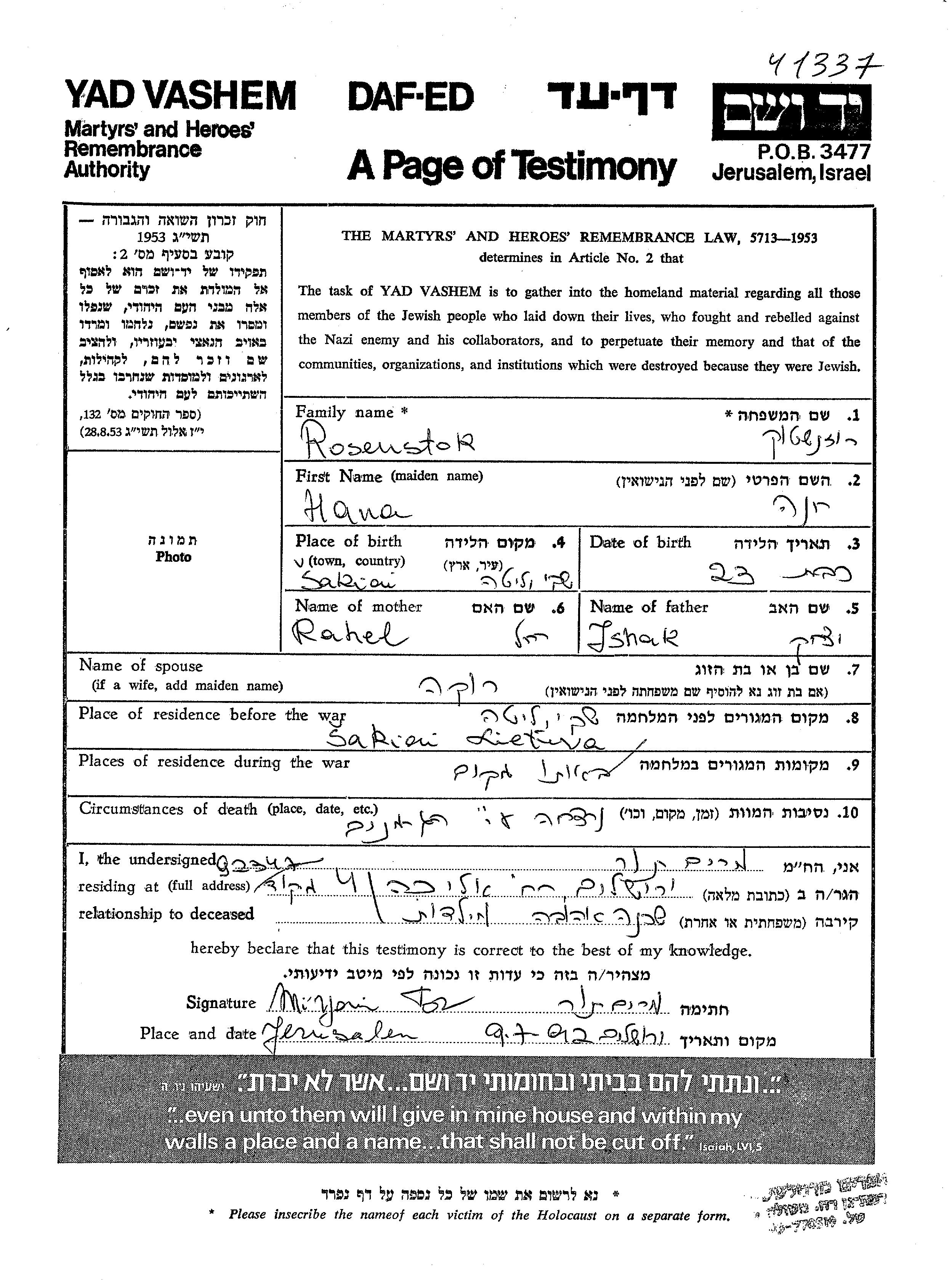 Rosenstok Hana Šakiai, Lituanie Feuille de témoignage
