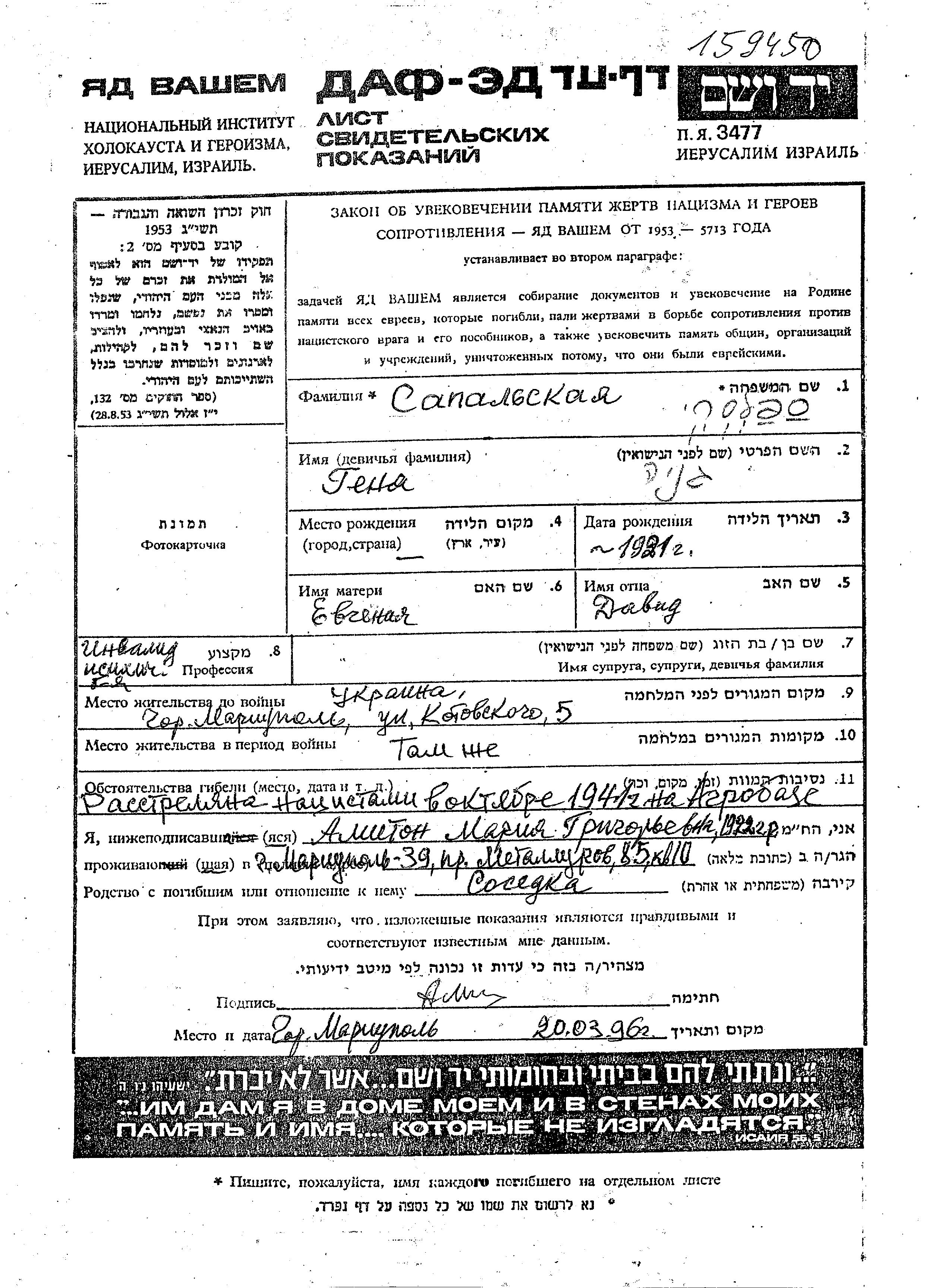 Sapalski Genia 1921 Mariupol, Ukraine (URSS) Feuille de témoignage