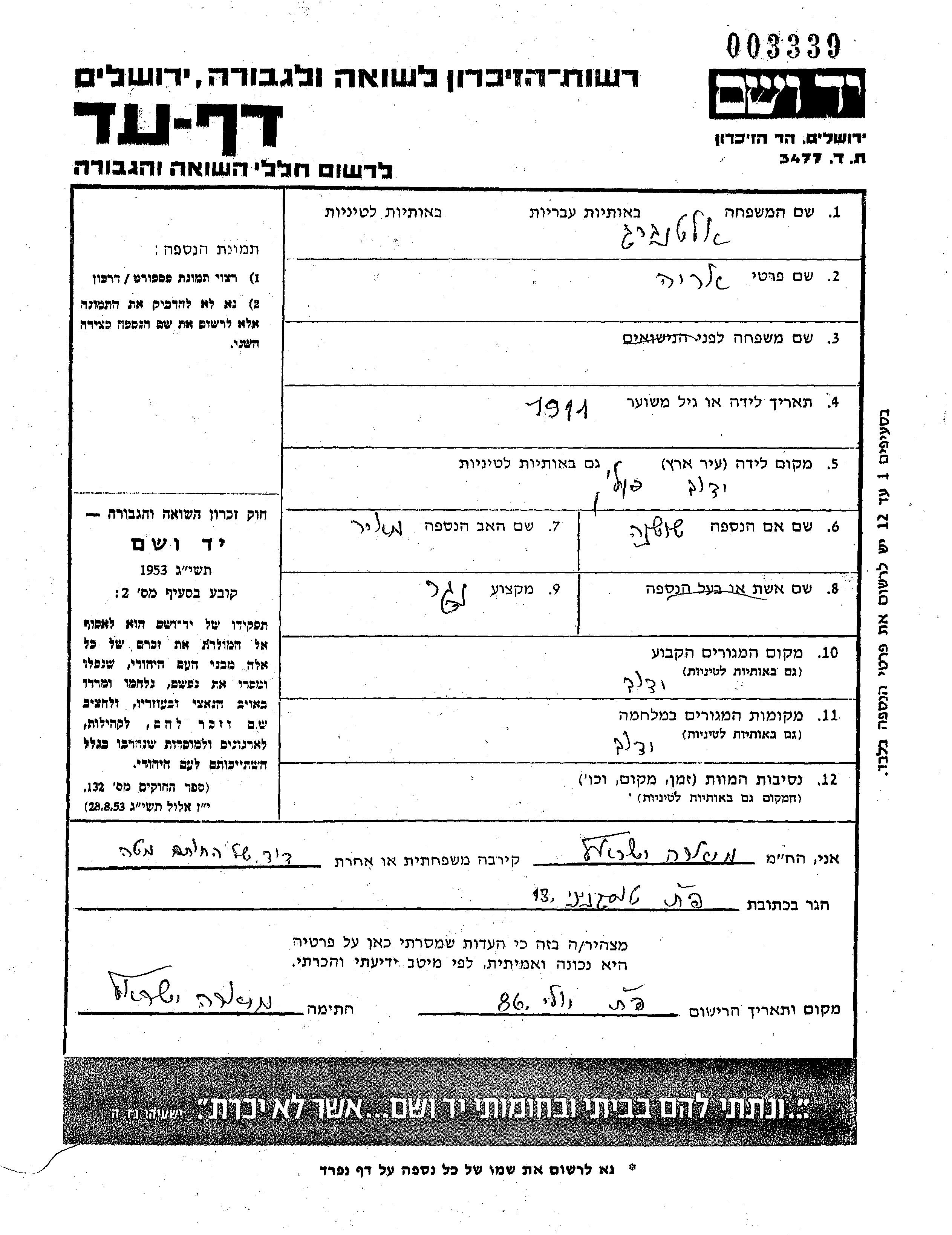 Yad Vashem - Pages of Testimony Names Memorial Collection