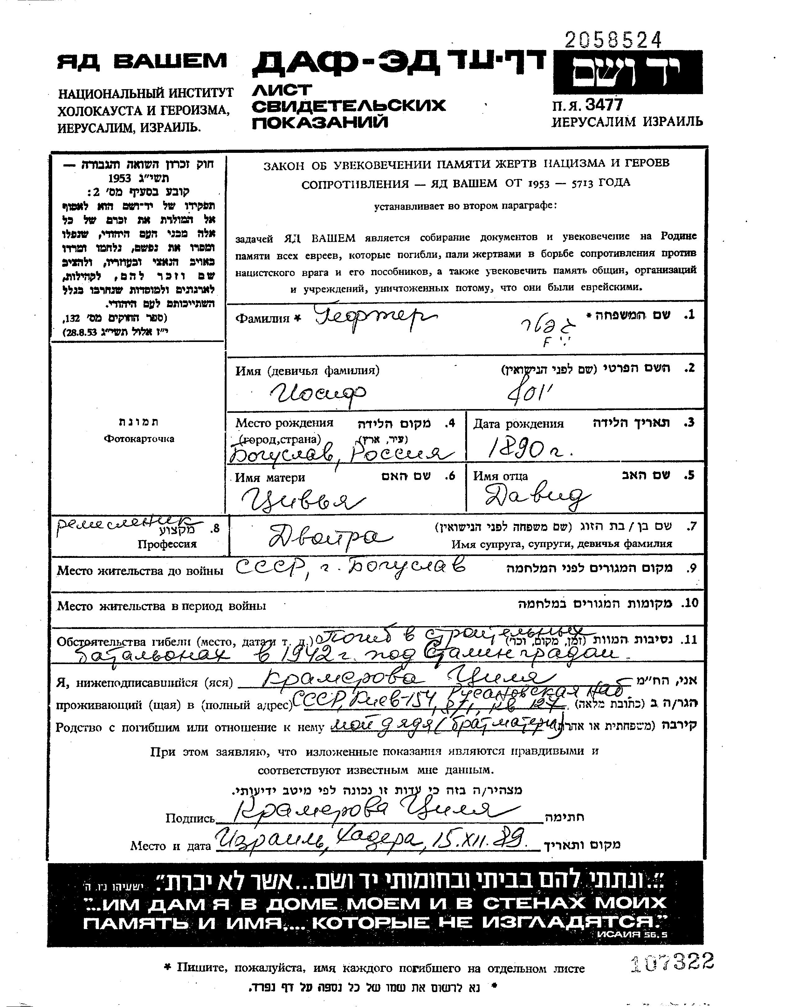 Iosif Gefter est né à Boguslav, Ukraine (URSS) en 1890, fils de David et de Tzvia née Golub. Il était Artisan et Mariée à Dvoira. Avant la seconde guerre mondiale il vivait à Boguslav, Ukraine (URSS). Au cours de la guerre, il était à the Soviet armed forces. Iosif a été tué en tant que militaire pendant la Seconde Guerre mondiale. Lieu de la mort: Stalingrad, Russie (URSS) en 1942.