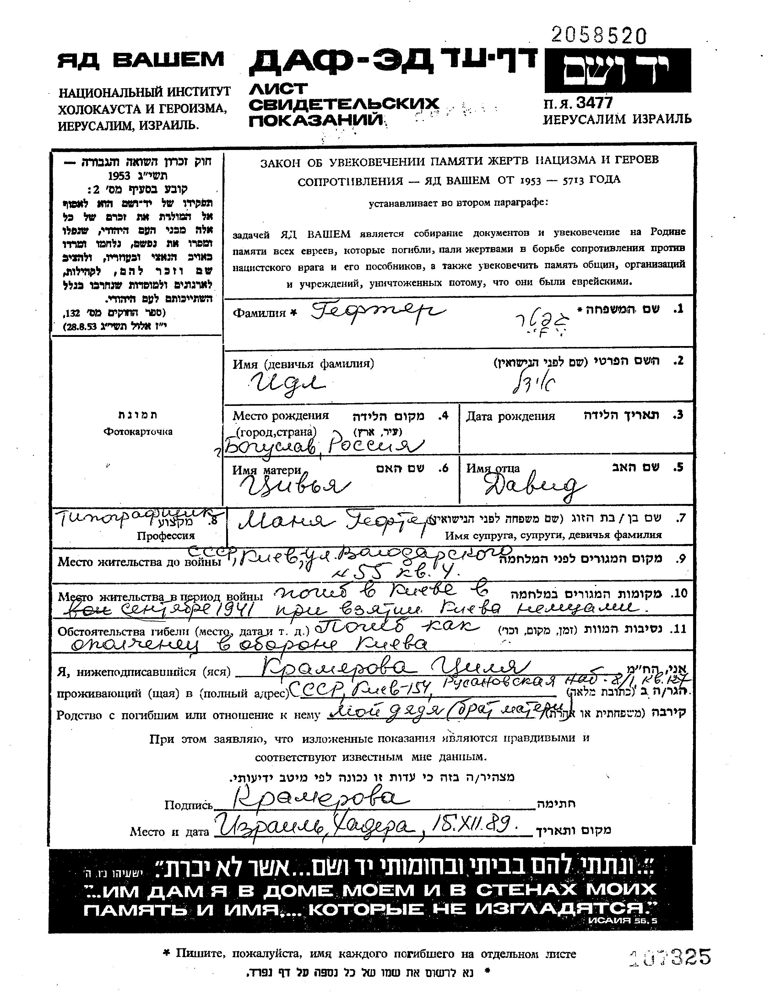Gefter Idl Kiyev, Ukraine (URSS) Feuille de témoignage