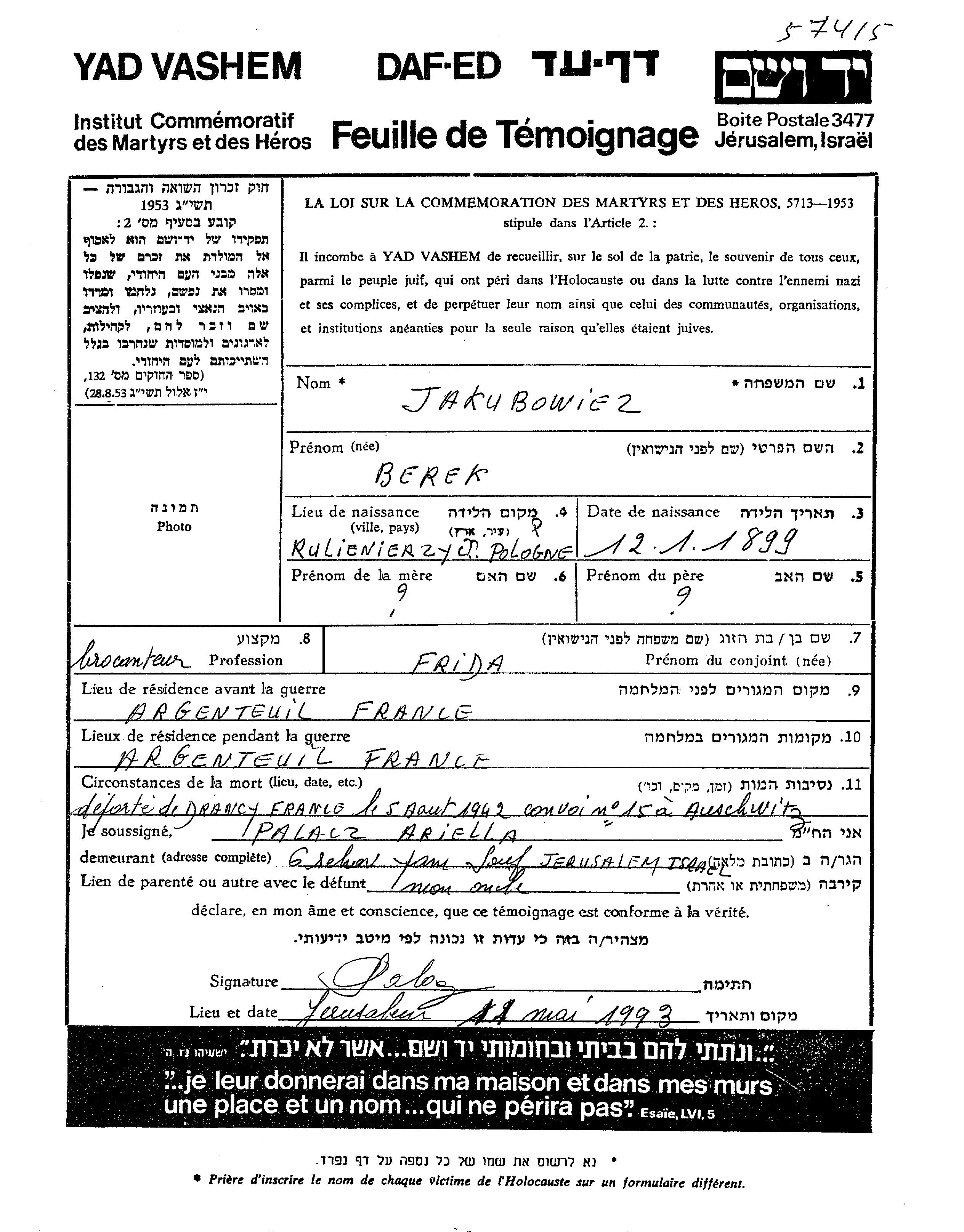 Jakubowicz Berek 1899 Argenteuil, France Feuille de témoignage
