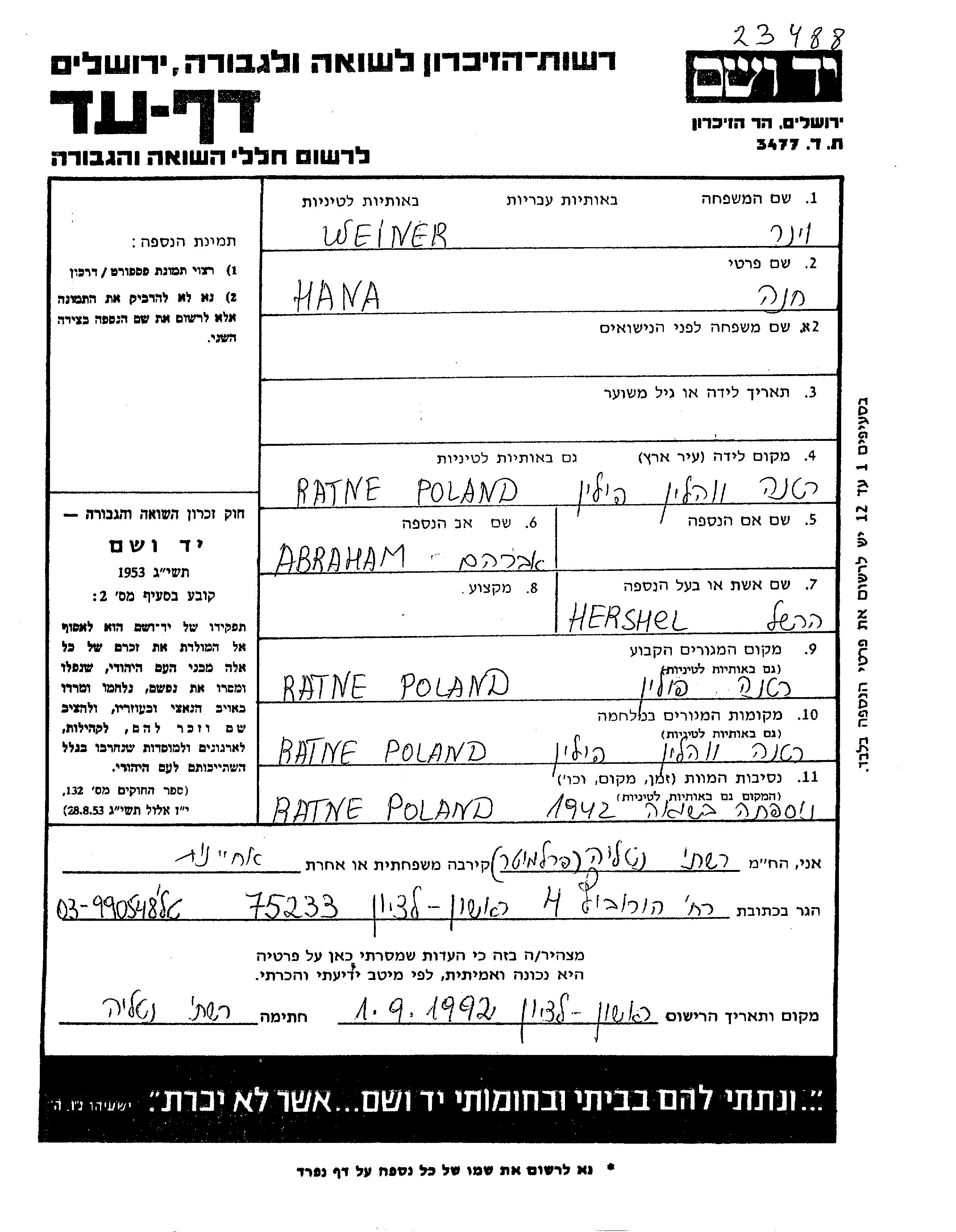 Weiner Hana Ratne, Pologne Feuille de témoignage