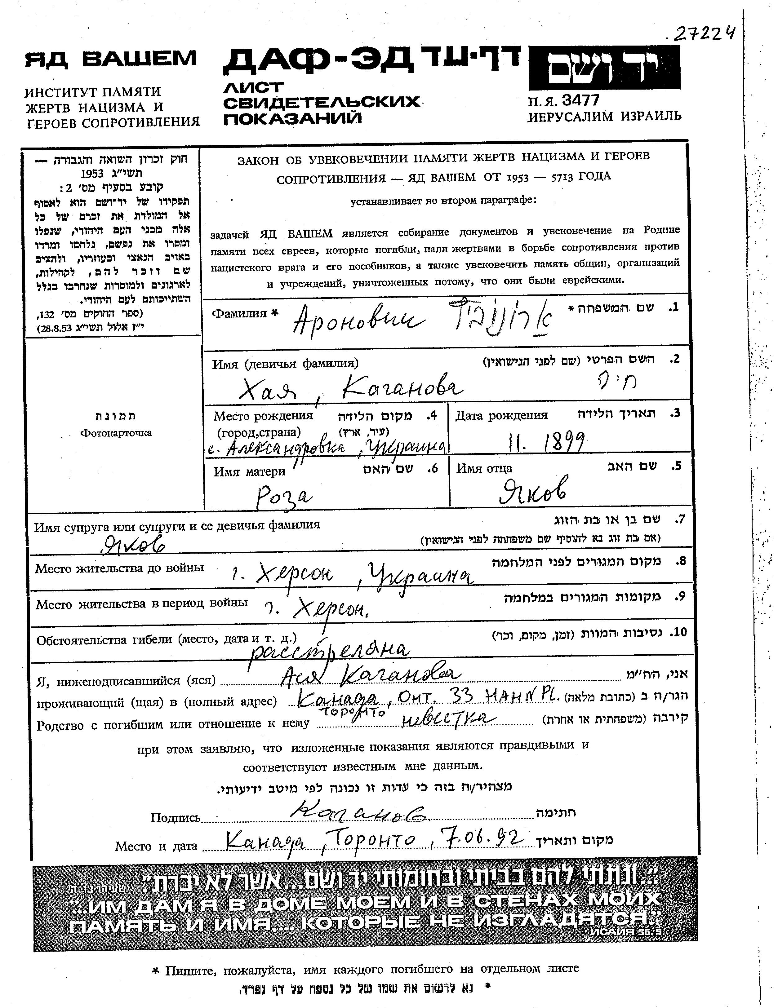 Aronovich Khaia 1899 Kherson, Ukraine (URSS) Feuille de témoignage