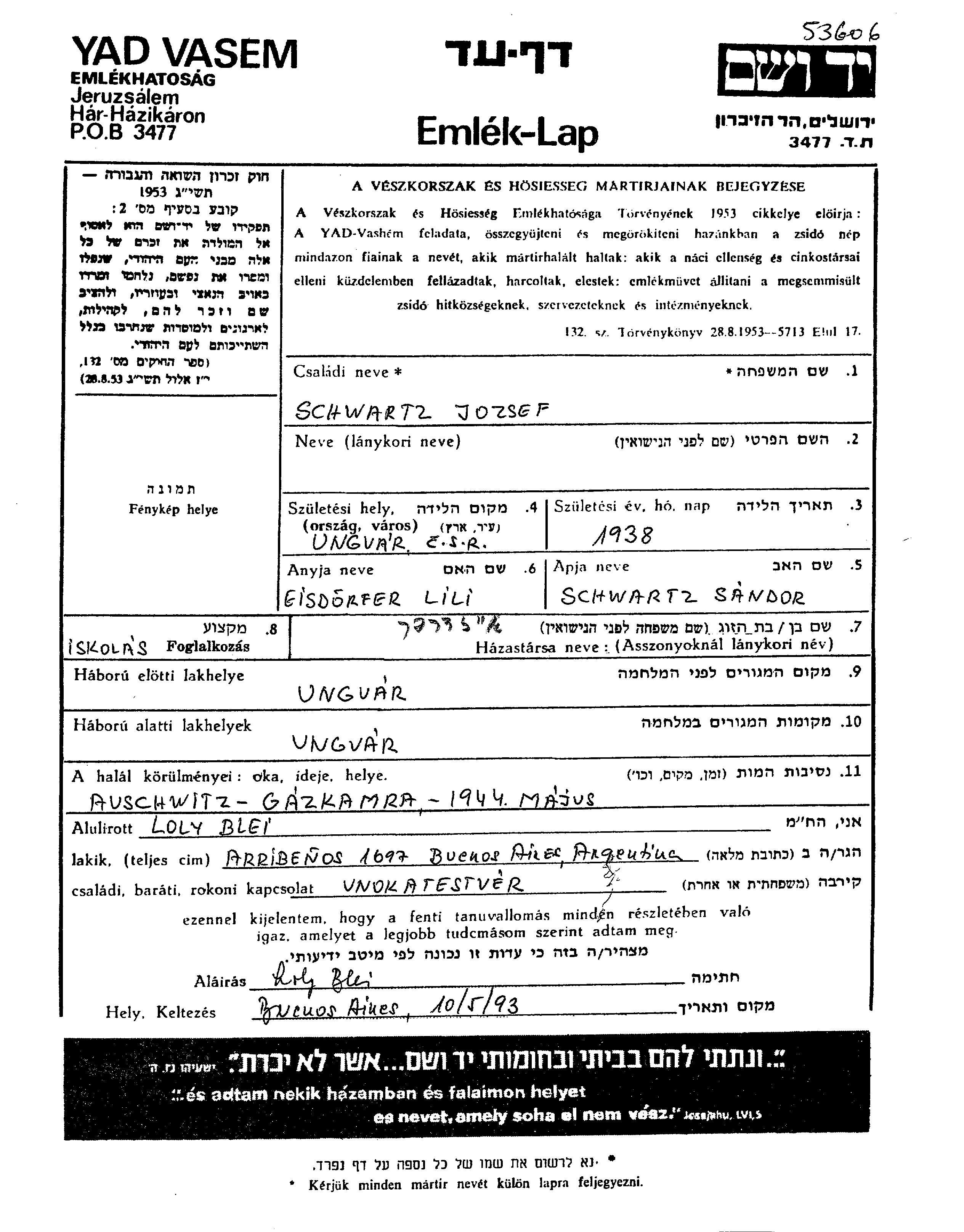 Schwartz Josef 1938 Ungvar, Tchécoslovaquie Feuille de témoignage