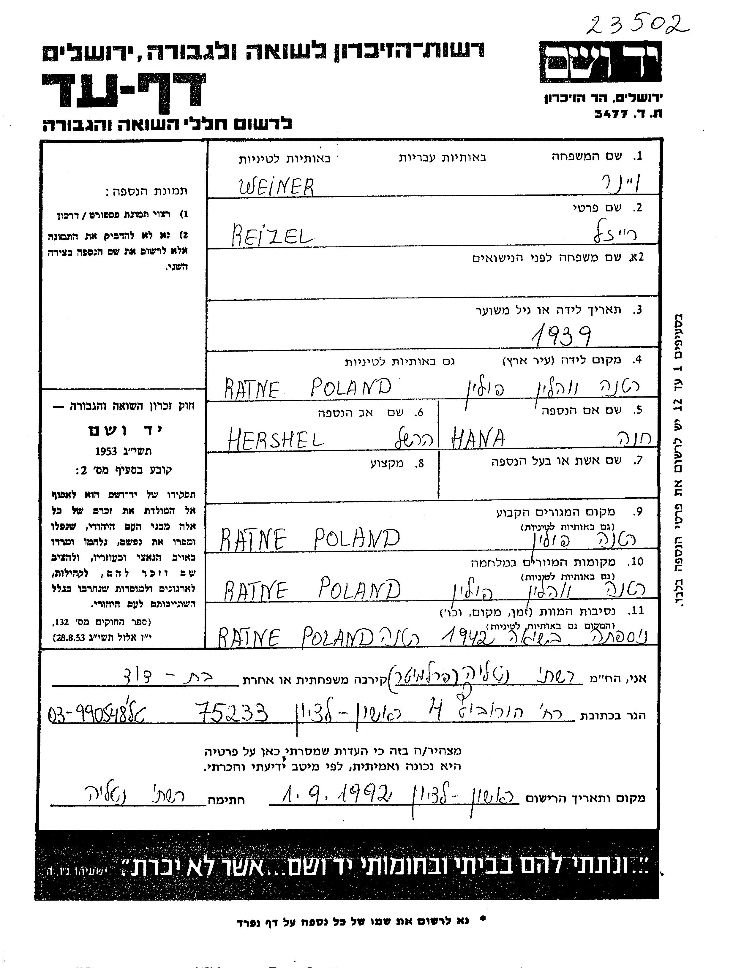 Weiner Reizl 1939 Ratne, Pologne Feuille de témoignage