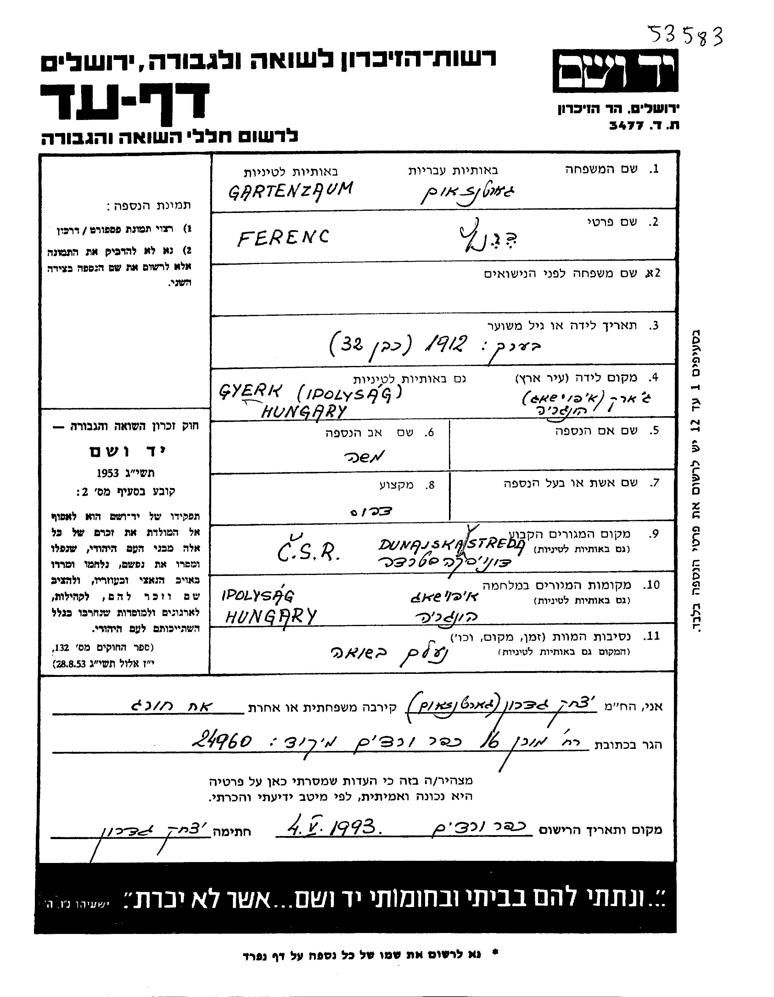 Ferentz Gartenzaum est né à Gyerk, Tchécoslovaquie en 1912, fils de Moshe. Il était Propriétaire d'une imprimerie. Avant la seconde guerre mondiale il vivait à Dunajska Streda, Tchécoslovaquie. Au cours de la guerre, il était à Ipolysag, Tchécoslovaquie.