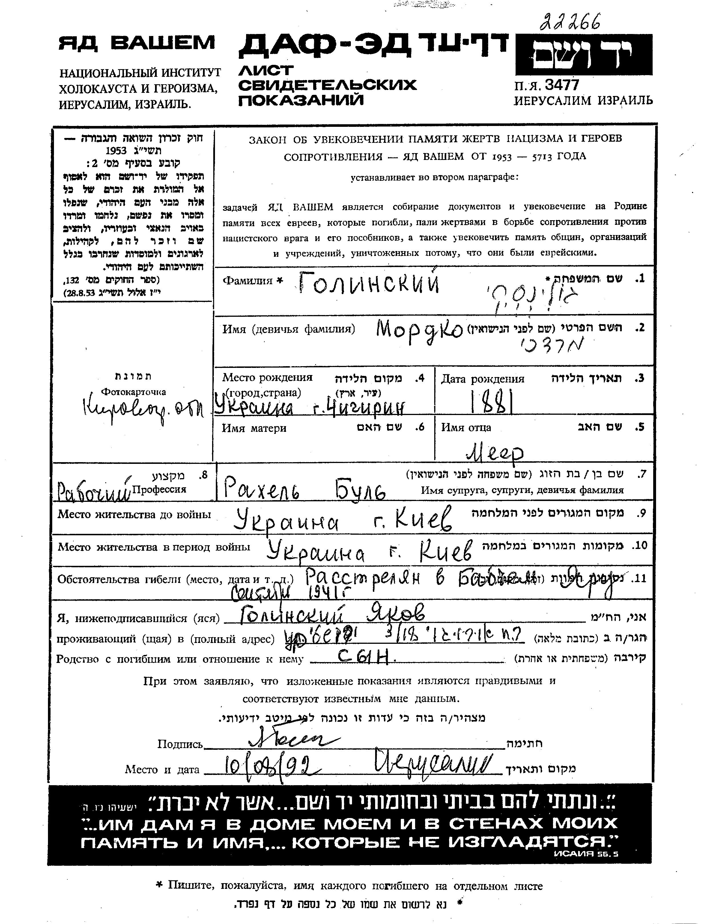 Golinski Mordko 1881 Kiyev, Ukraine (URSS) Feuille de témoignage