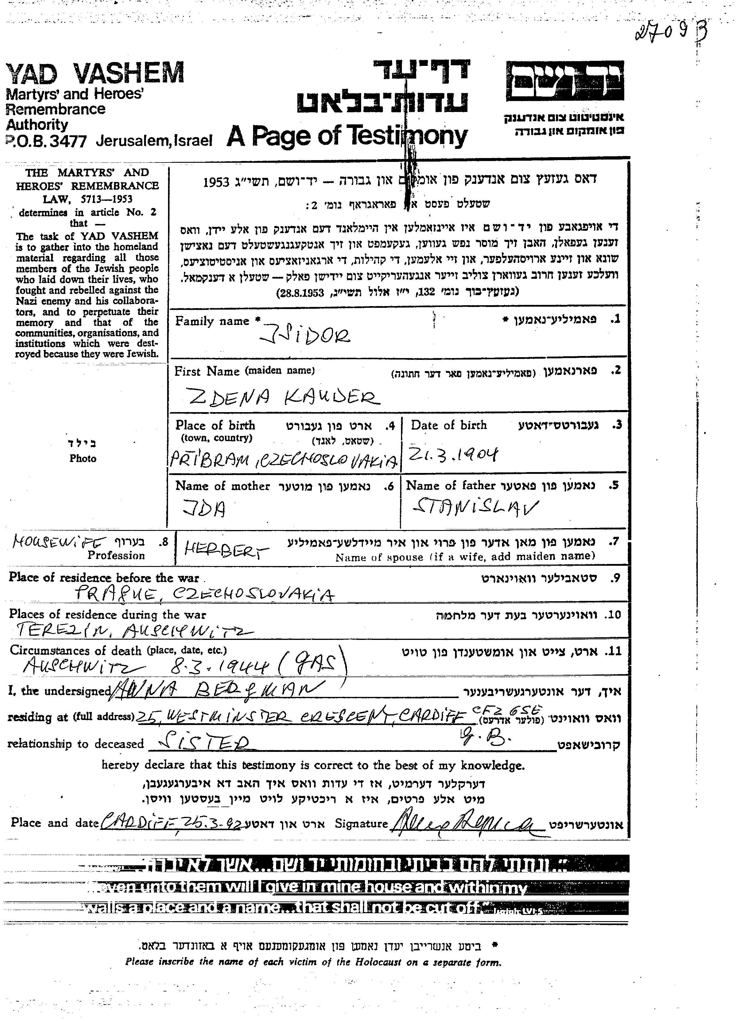 Isidor Zdena 1904 Praha, Tchécoslovaquie Feuille de témoignage