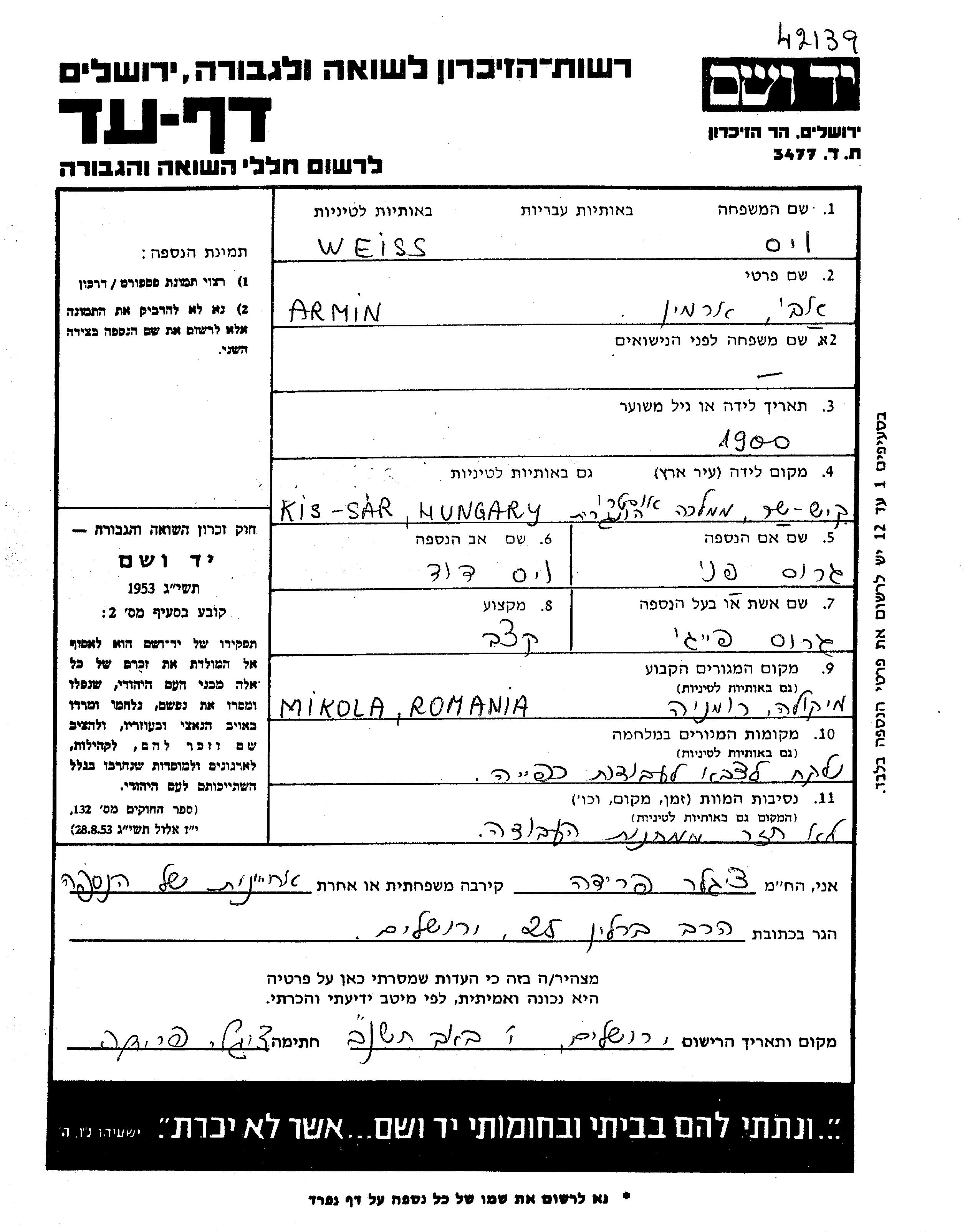 Weiss Abi Armin 1900 Mikola, Roumanie Feuille de témoignage