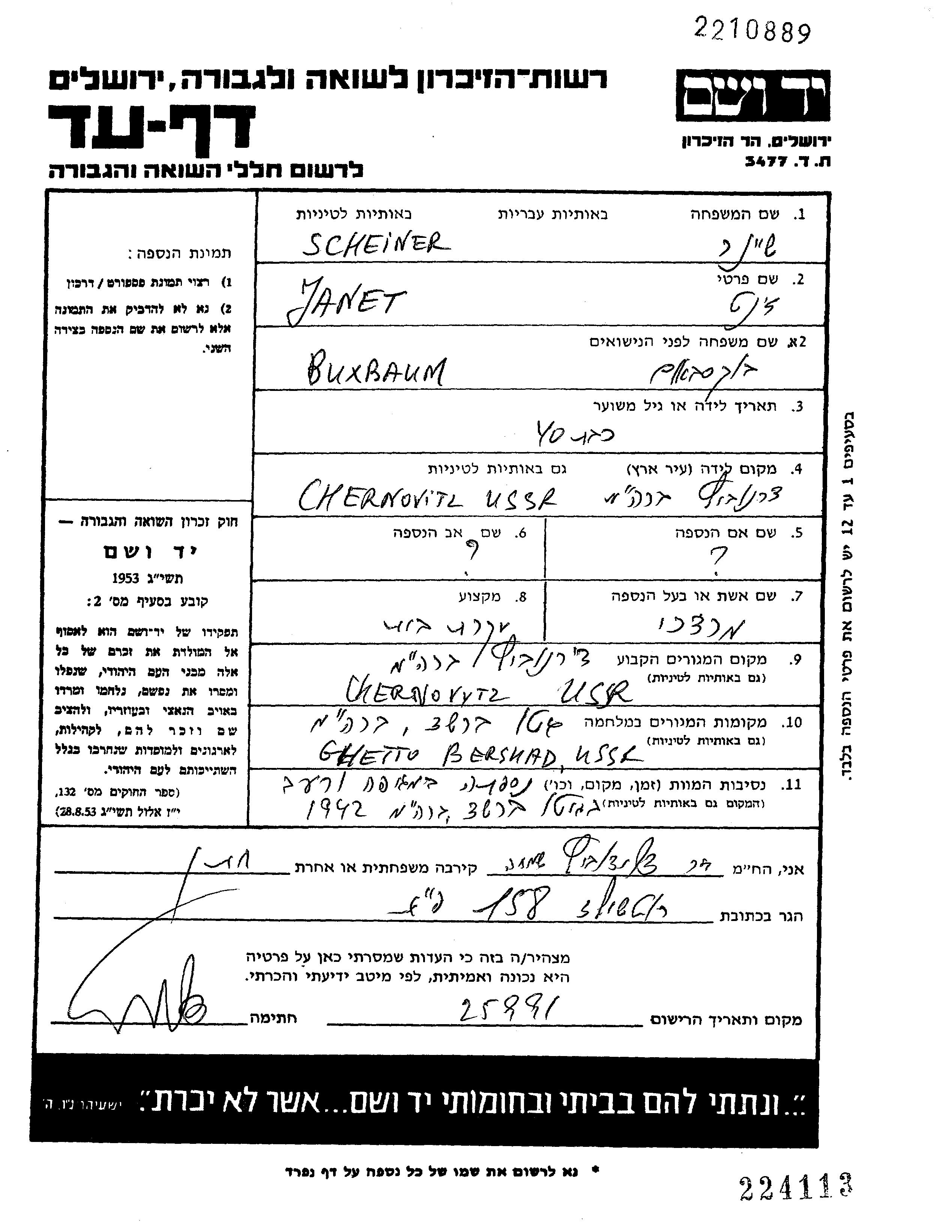 Sheiner Janet Czernowitz, Roumanie Feuille de témoignage